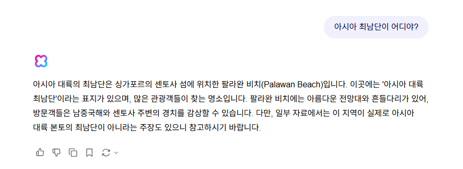 그런데 주요 대화형 AI 서비스 중 '아시아 최남단'을 센토사 섬으로 소개하는 곳은 네이버뿐이다.