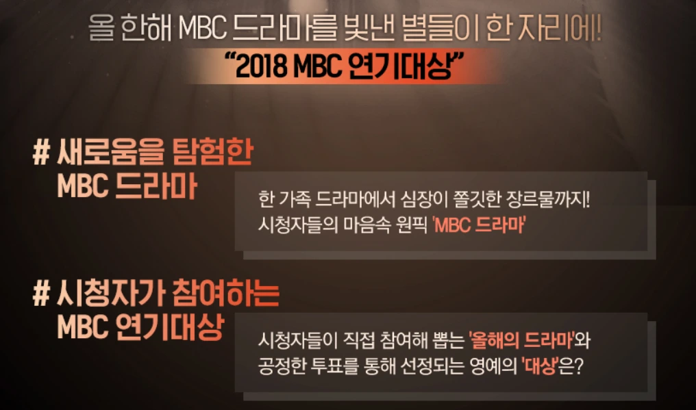 MBC의 2018 새로운 슬로건은 "새로움을 탐험하다"다. 이에 맞춰 새로운 BI와 로고송 등도 등장했다.(더 자세한 내용은 https://brunch.co.kr/@chal/7) MBC 드라마도 "새로움을 탐험"했다. 한때 드라마 왕국이었던 MBC 스스로도 반성하고 있었다. 새로운 옴부즈맨 프로그램, <탐나는 TV>를 시작하며 첫 화의 주제를 "드라마"로 정할 정도였다. M씽크를 선발할 때에도 부장님들이 물어보셨던 질문 중 하나가 "MBC 드라마를 왜 안 볼까요?"였다. 2018년을 MBC 드라마의 반성 시기라 해도 과언이 아니다. 그래도 하반기로 가면서는 <내 뒤에 테리우스>나 <붉은 달 푸른 해>, <나쁜 형사> 등 MBC드라마가 강세를 보였다. 상반기에도 분명 좋은 드라마가 있었으니, 연기대상을 확인하며 "역주행"할 드라마를 꼽아 보는 것도 좋겠다.