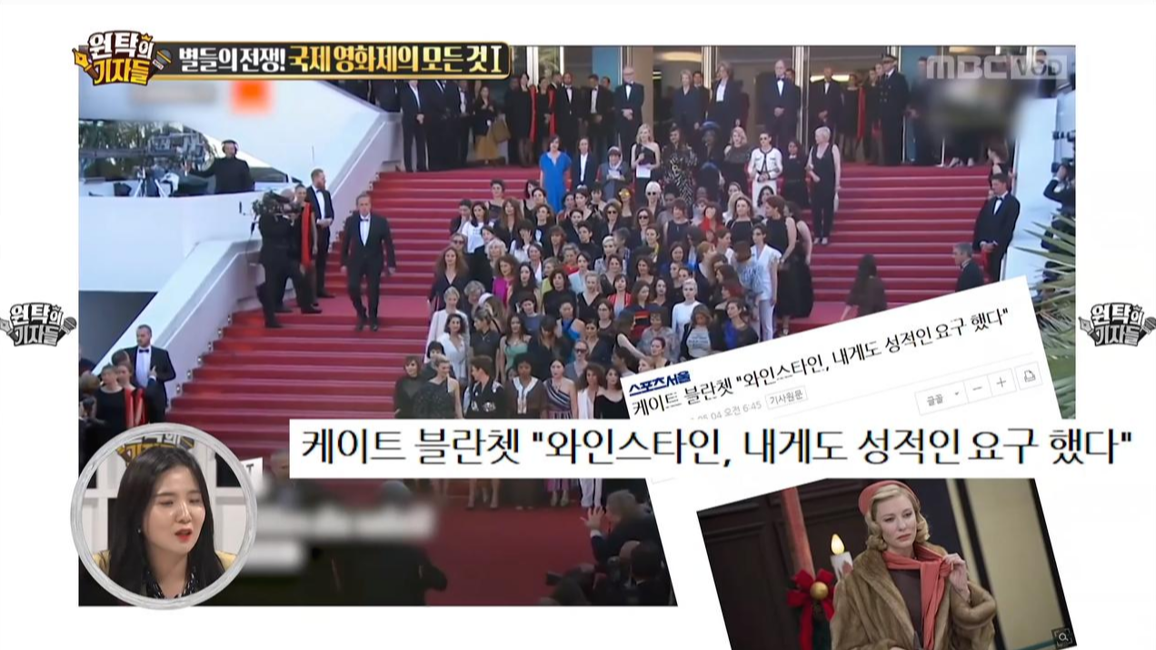 <원탁의 기자들>도 필자와 마찬가지로 칸영화제의 권위로 이야기를 시작했다. 이후 올해의 칸 영화제가 특별한 이유를 심사위원장 케이트 블란쳇으로 꼽았다. 블란쳇이 입은 드레스는 3년 전 그녀가 칸의 레드카펫에서 입었던 드레스라는 이야기를 들을 수 있었다. 김지현 기자가 설명하는 동안 화면에는 크리스틴 스튜어트가 하이힐을 벗는 장면과, 케이트 블란쳇이 하비 와인스타인의 성추행을 폭로한 기사가 "지나갔다." 그렇다. 지나갔다. 크리스틴 스튜어트의 장면에서도 "하이힐을 벗는 퍼포먼스 등 다양한 퍼포먼스를 통해 권위에 도전하는 모습을 볼 수 있었다"며 지나갔다.