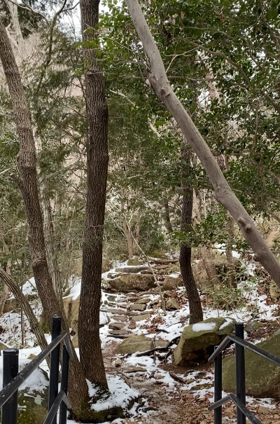 등산로에 접어들자마자 맑은 공기의 변화가 느껴졌다. 며칠 전 내린 눈이 풀 위에 쌓여 있기도 했지만 계곡의 물은 얼지 않고 졸졸졸 소리를 내며 경쾌하게 흘러내렸다. 등산을 자주 해보지 않은 두 딸은 월출산에 간다고 할 때엔 썩 내키지 않은 표정이더니 경포대 삼거리까지 1km 정도의 구간이라는 것을 알고 안심한 듯 앞서 걷기 시작했다. 계곡의 맑은 물과 곳곳에 핀 동백꽃에 감탄하며 오르는 동안 벌써 정오에 가까운 시간이라 하산하는 등산객들을 마주치게 되었다. 위쪽은 아직 얼음이 많은지 다들 아이젠을 손에 들고 내려오는 참이었다. 맨손에 운동화 차림으로 산책을 하고 있는 우리와는 대조적인 풍경이었다.