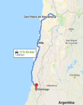 여행자들이 무거운 배낭을 걸머지고 하나 둘 버스에 올랐다. 드디어 여행자들로 만원이 된 버스는 저녁 7시 30분 정각에 출발했다. 산 페드로 데 아타카마에서 산티아고까지는 1,630km의 긴 여정으로 30여 시간이 넘게 걸린다고 한다. 서울에서 목포를 무려 5번이나 왔다 갔다 하는 거리다. 길이 너무나 멀기 때문에 저녁이면 담요도 주고 식사 때가 되면 차장이 식사와 차를 배급해 주었다. 운전수도 2명이 타고 서로 교대를 했다.