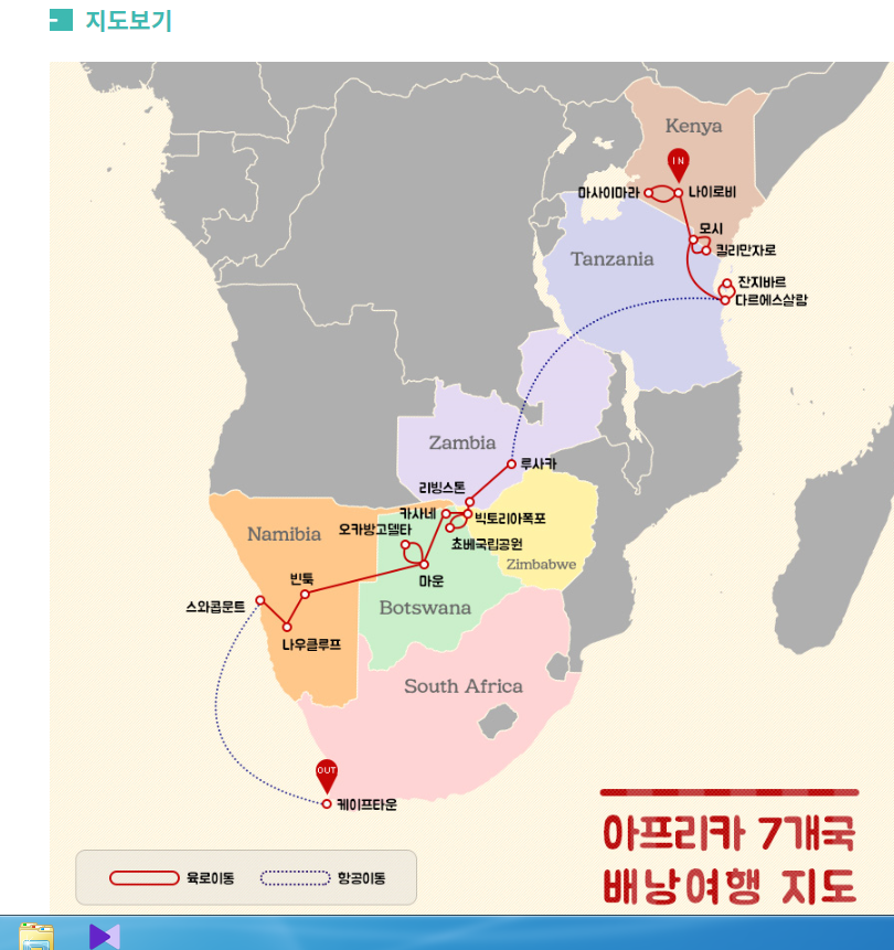 차선책으로 선택한 것이 노매드 아프리카 여행사(Nomad Africa Adventure Tours) 여행사를 통해서 떠나는 아프리카 트럭킹 종단 여행이었다. 그러나 트럭킹 종단 여행은 기간이 최소한 40일 이상이 걸렸다. 항공시간까지 합하면 45일 정도가 소요되었다. 아내는 여행기간이 너무 길고, 노인이 텐트에서 잠을 자고 트럭을 타고 다니는 것이 보통 고된 일이 아니며, 그러다가 병이라도 나면 큰일이라며 또다시 브레이크를 걸었다. 듣고 보니 아내의 말을 들어서 손해 날 것은 없을 것 같기도 했다. 추위를 잘 견디지도 못하는 체질인데 40일이 넘게 야생의 텐트에서 잠을 잔다는 것이 무리는 무리다.
