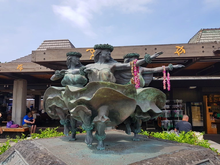 휴게소에서 잠시 휴식을 취한 뒤 공항청사 밖으로 나가니 광장에 훌라 춤을 추는 원주민 동상이 보였다. 누군가가 플루메리아 꽃을 원주민의 어깨에 걸어주어 더욱 생동감이 넘쳐 보였다.