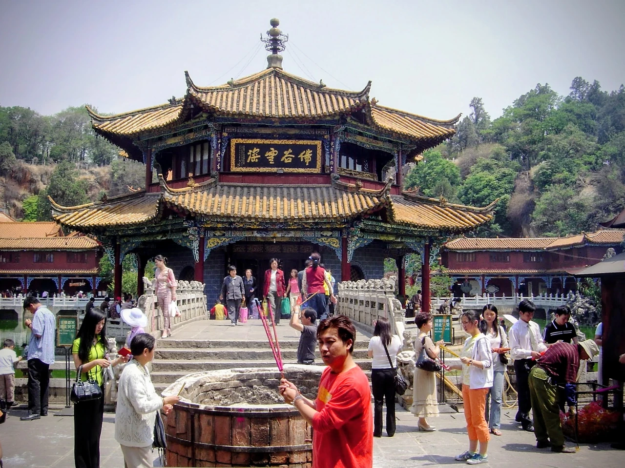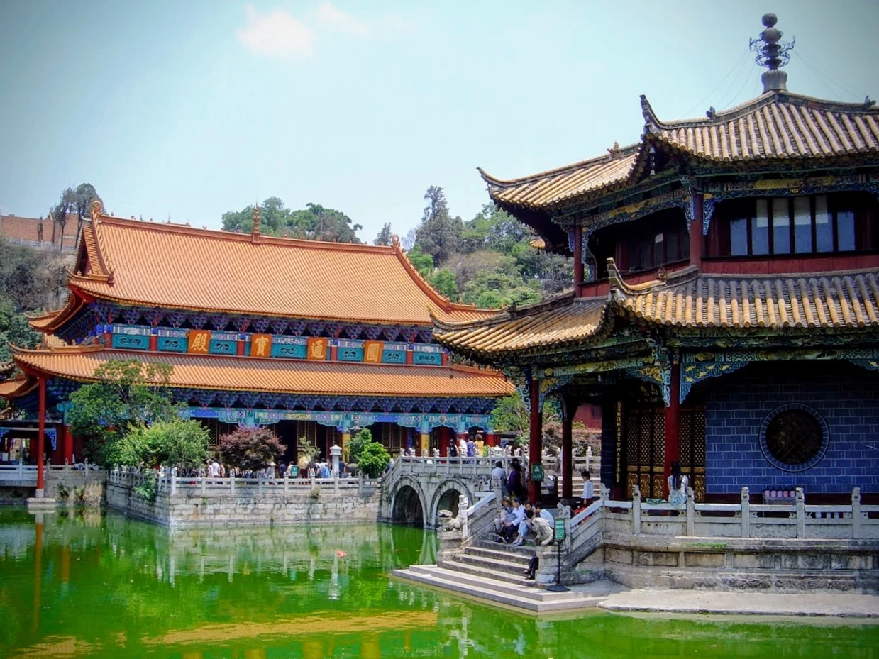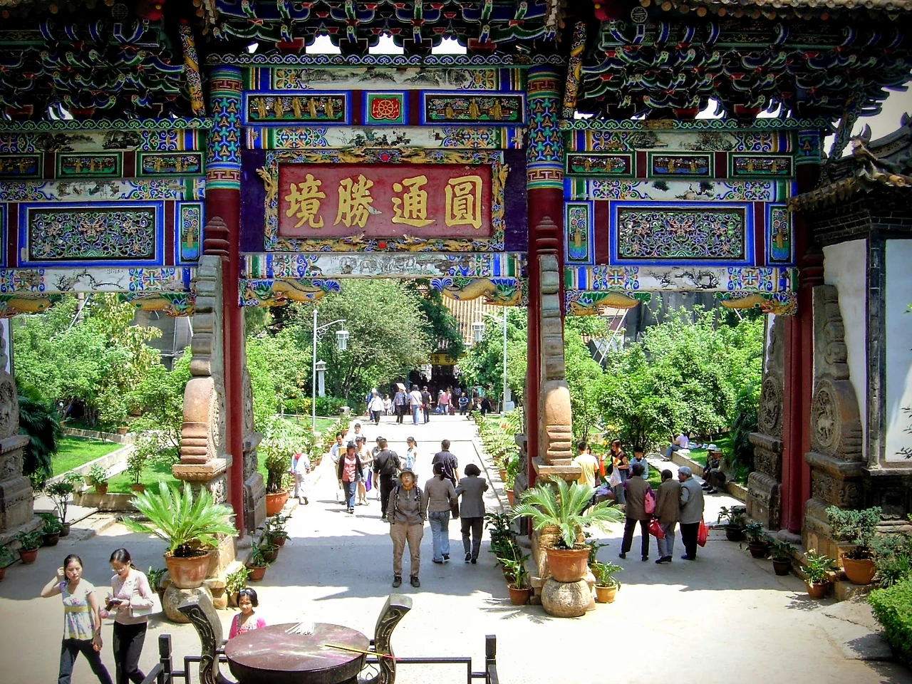 5번 버스를 타고 도착한 곳은 원통사. 단나라 시기에 창건되어 1200년이 넘은 역사를 지닌 윈난 성 불교의 중심 사찰이다. 도심의 소란을 한 걸음 벗어나면, 계단 아래로 숨은 듯한 이 사찰이 모습을 드러낸다. 보통의 절은 산 위로 올라야 닿지만, 이곳은 거꾸로 발걸음을 낮추어야 본당에 닿는다. 마치 수행자가 하심(下心)의 길로 내려가듯, 나 또한 고개를 숙이고 마음을 낮추어 연못과 다리를 지나 불전 앞에 서게 된다. 도심 속에 있지만, 원통사는 고요와 맑음을 간직한 피난처 같은 곳이다.