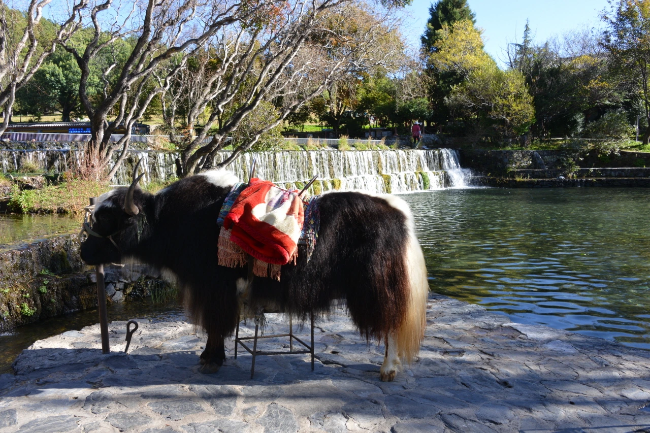 사원아래로 내려오면 연못가에 야크들이 매여져 있다. 관광객을 태우고 모델 역할을 하는 야크이다. 긴털과 옥빛 폭포가 잘 어울린다. 하지만 야생에서 풀을 뜯으며 자유롭게 살아야 하는데 짧은 줄에 매여져 인간의 돈벌이 역할을 하고 있으니 측은한 생각이 든다.