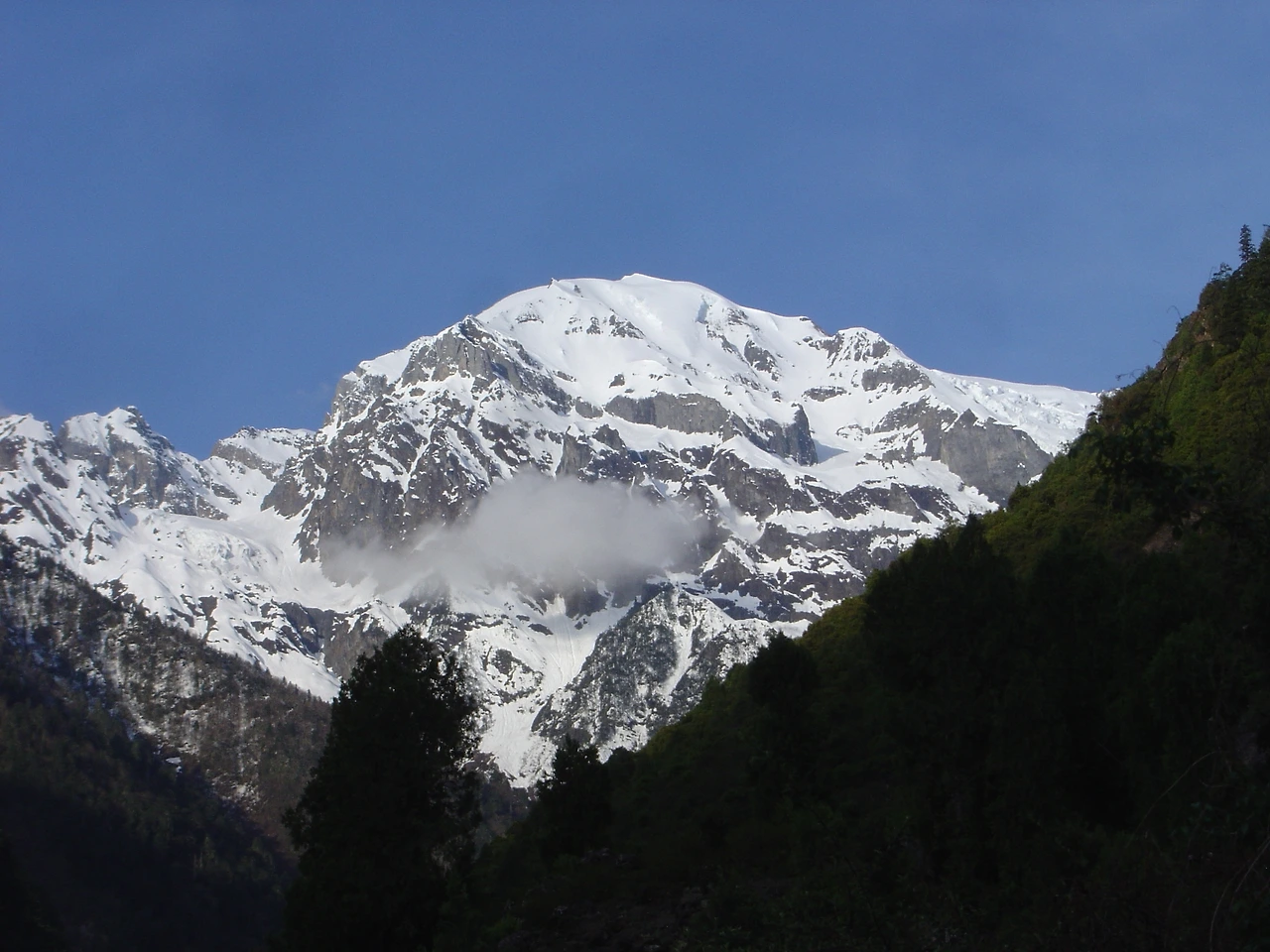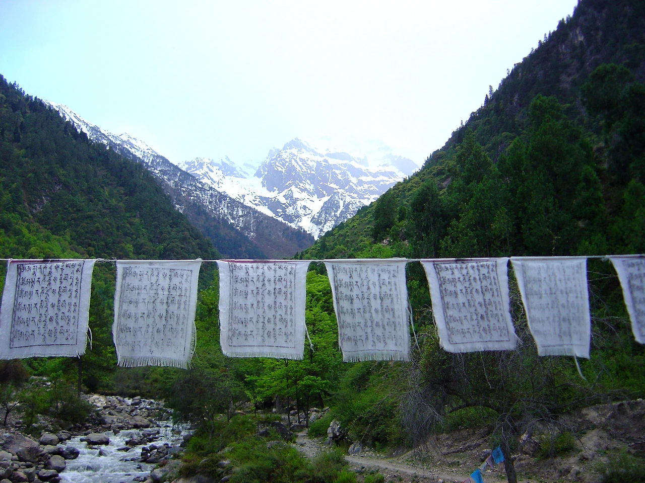 그때, 구름 속에서 설산의 봉우리가 베일처럼 드러났다 사라졌다. 그것은 신의 얼굴이 엿보였다 사라지는 듯한 순간이었다. 카와카르포 ― 인간의 발길이 닿지 못한 신의 산이다. 티베트인들이 ‘설산의 신’이라 부르는 카와카르포(卡瓦格博, 6,740m)가 좌우대칭의 계곡 위로 눈부신 피라미드처럼 솟아 있었다. 룽다 사이로 보이는 설산이 신비감을 더해 주었다.