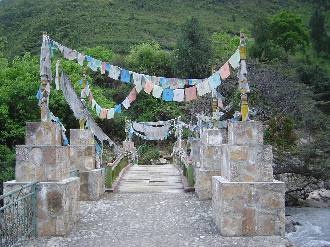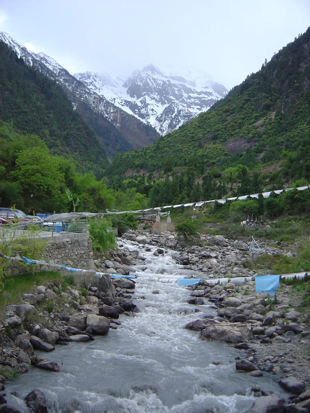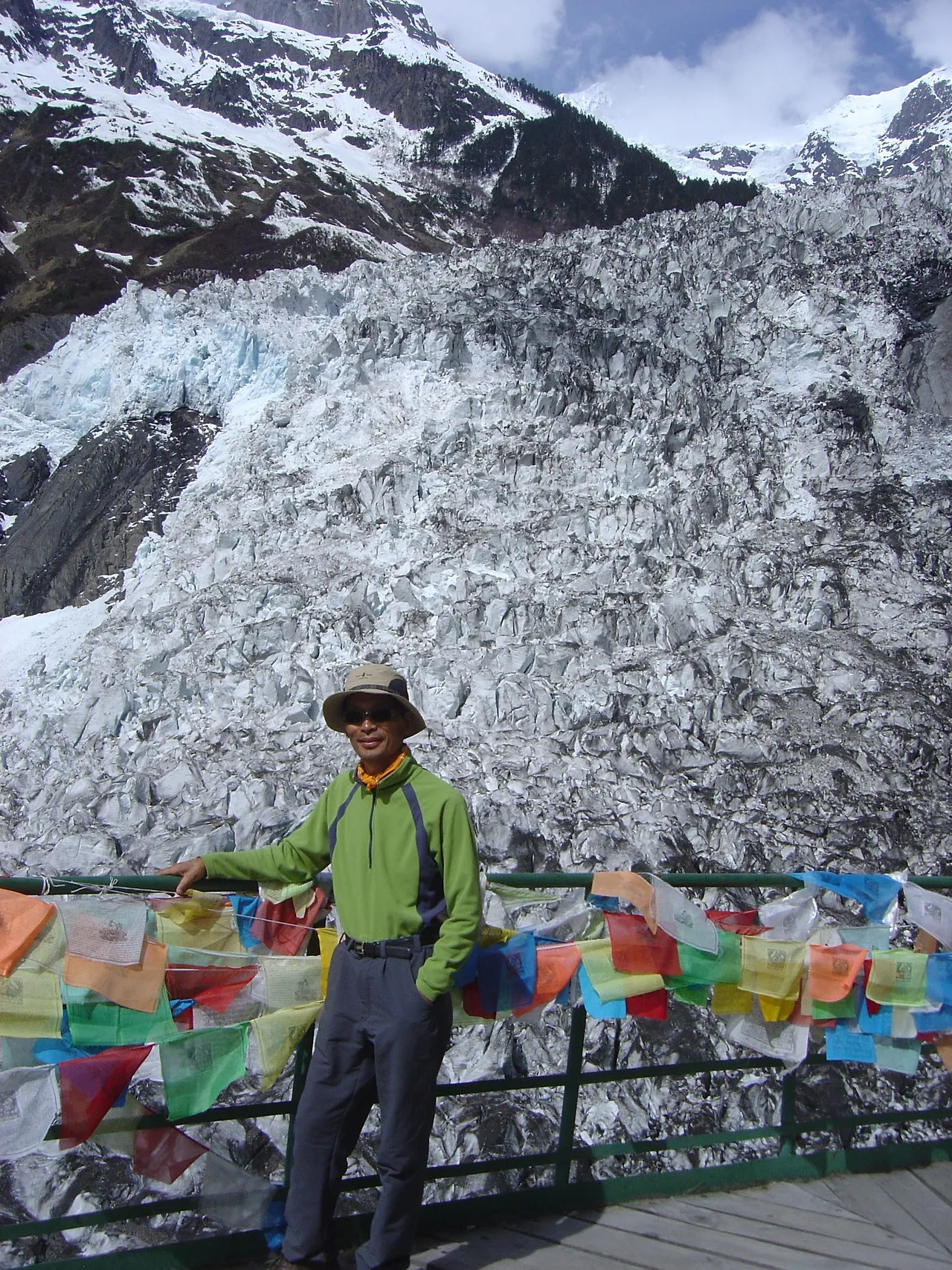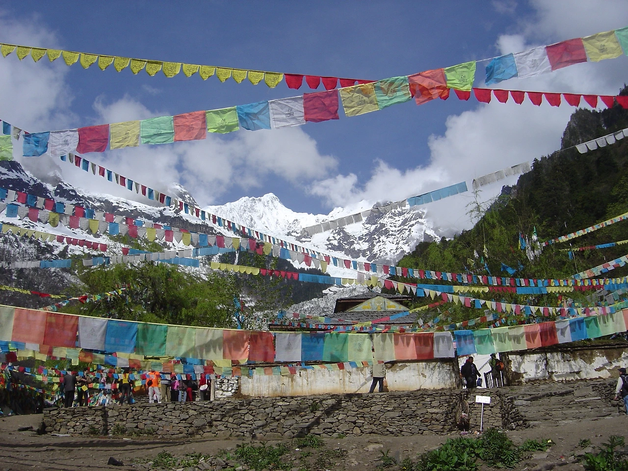사원 앞쪽은 자연 그대로의 전망대처럼 트여 있으며, 바로 아래로는 밍융빙천(明永氷川)이 흘러내렸다. 매리설산의 주봉 카와카르포가 정면으로 보였다. 마치 하늘이 열리고 신이 손짓하는 듯한 풍경이다.