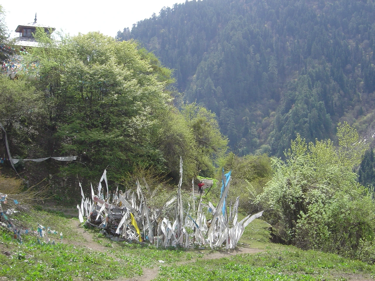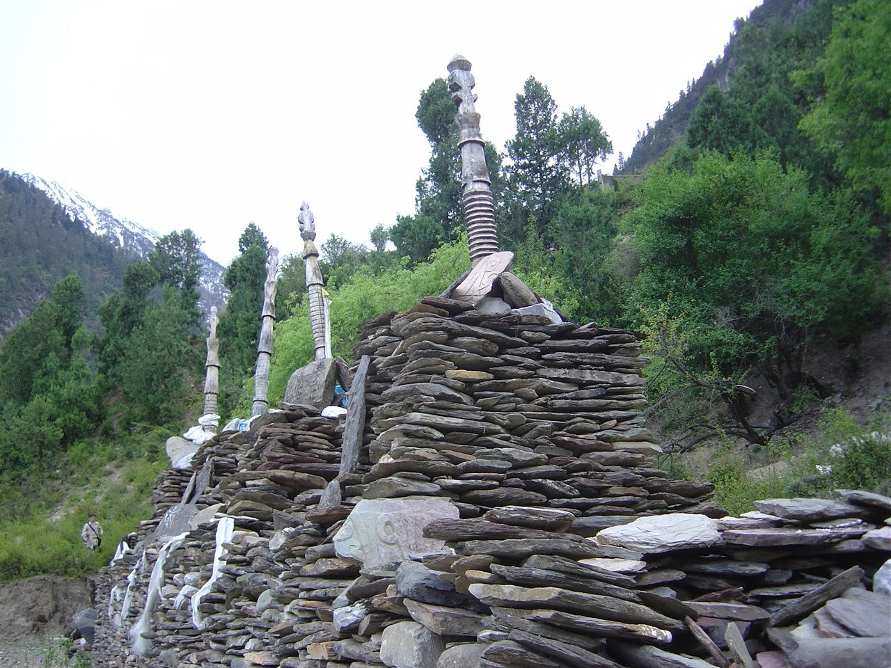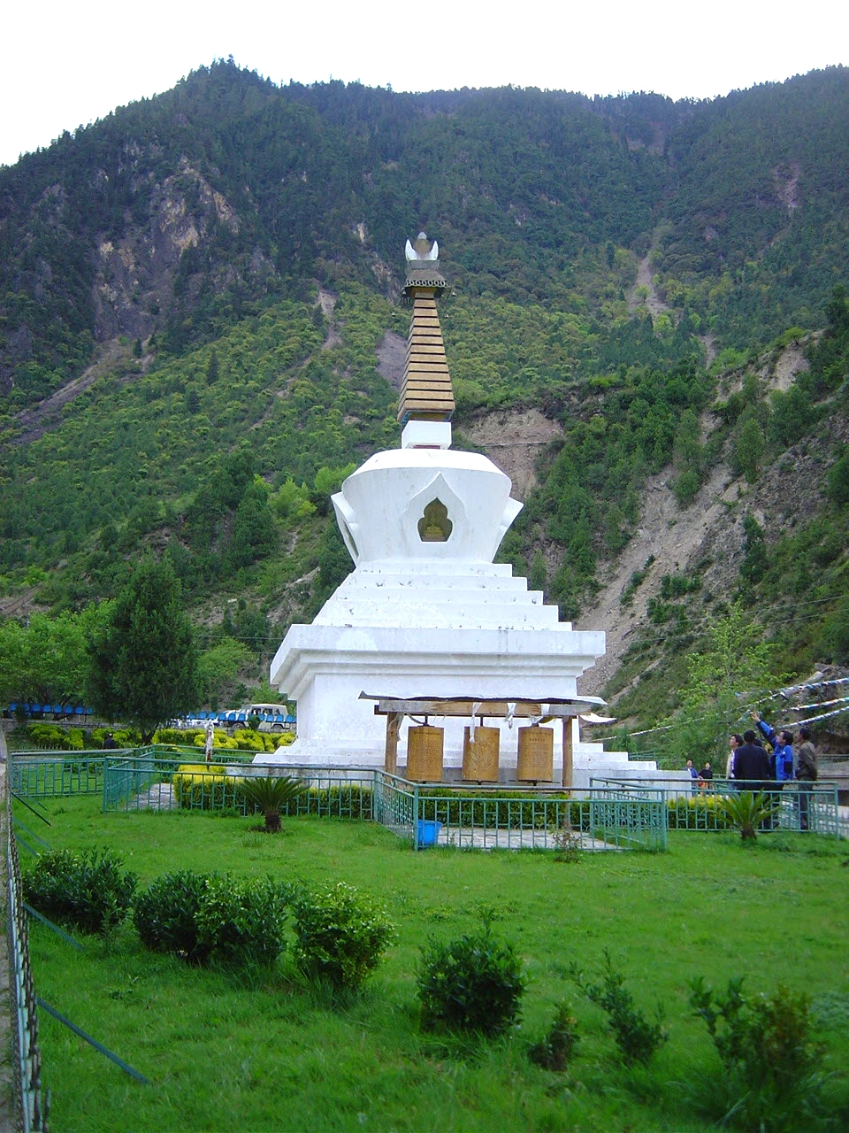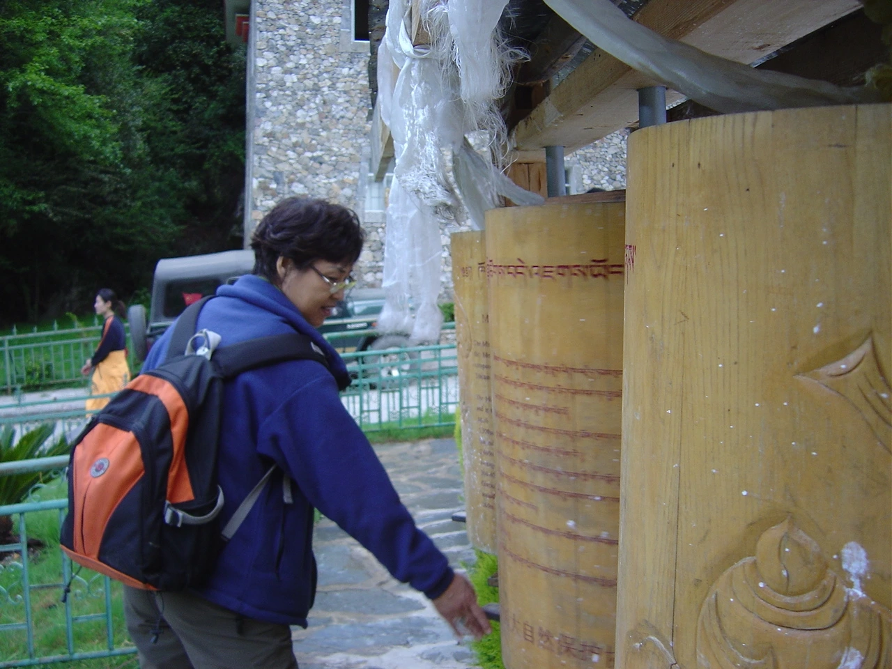 길을 따라 오르니, 하얀 쵸르텐이 매리설산 골짜기를 지키고 있었다. 초르텐 앞에 황금 마니차 세 개는 아직도 이곳이 티베트의 영혼이 깃든 땅임을 증언하듯 바람결에 은은히 돌고 있었다. 우리는 카타에 감긴 마니차를 돌리며 이곳까지 무사히 인도한 부처께 감사의 기도를 올렸다.