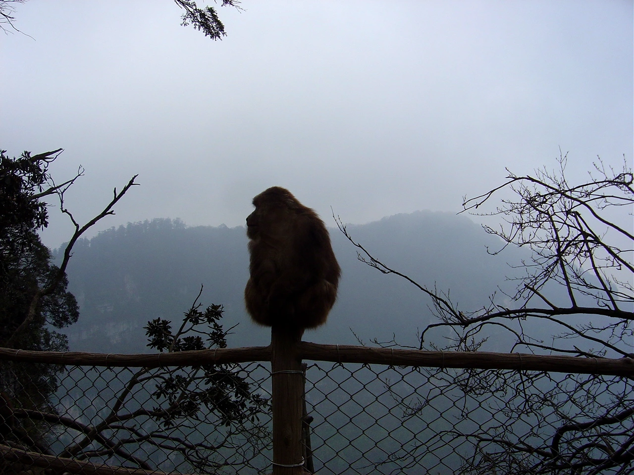안개가 길을 덮을 때마다, 세상은 마치 다른 차원의 문을 여는 듯 고요했다. 그때였다. 나무 울타리 위에 한 존재가 앉아 있었다. 회색빛 안갯속, 한 마리의 원숭이가 허공을 바라보고 있었다.