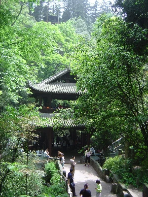 폭포에서 숲길을 따라 내려오니 순양전(純陽殿)에 이른다. 아미산 정상으로 오르는 길목, 금정사로 향하는 산허리에 구름 사이로 순양전 고요히 모습을 드러낸다. 도교의 성인 여동빈(呂洞賓)을 모신 도관(道觀)이다.