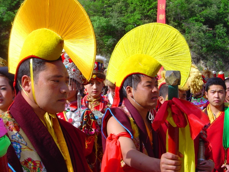 그들은 노래했고, 장족 북은 낮은 산울림처럼 울렸으며, 퍼레이드는 마치 하늘이 펼친 색채의 강(江)처럼 천천히 계곡을 따라 흘러갔다.