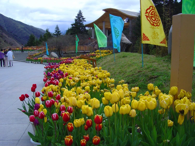 눈 때문에 예정 시간보다 한 시간 늦은 10시 30분. 드디어 황룡 입구가 모습을 드러냈다. 낯선 풍경—거친 고원에 뜬금없이 만개한 튤립들이 붉고 노랗게 피어 있었다.