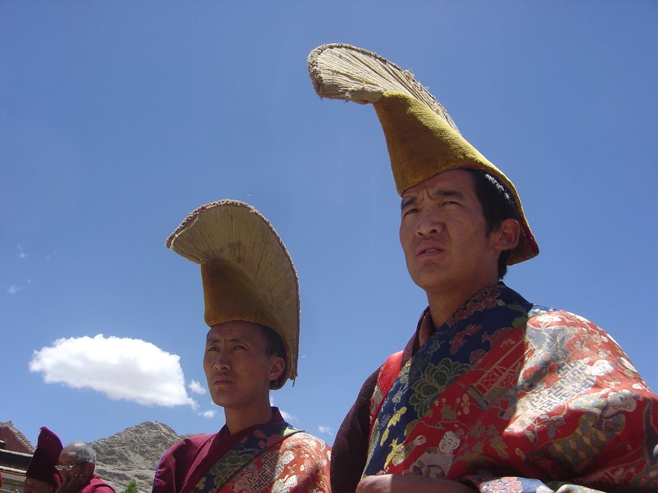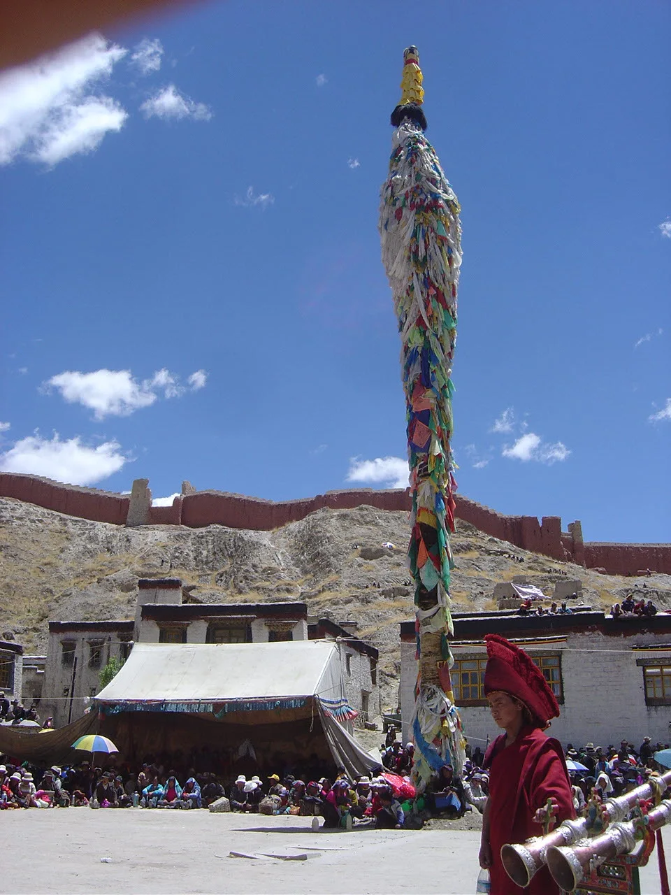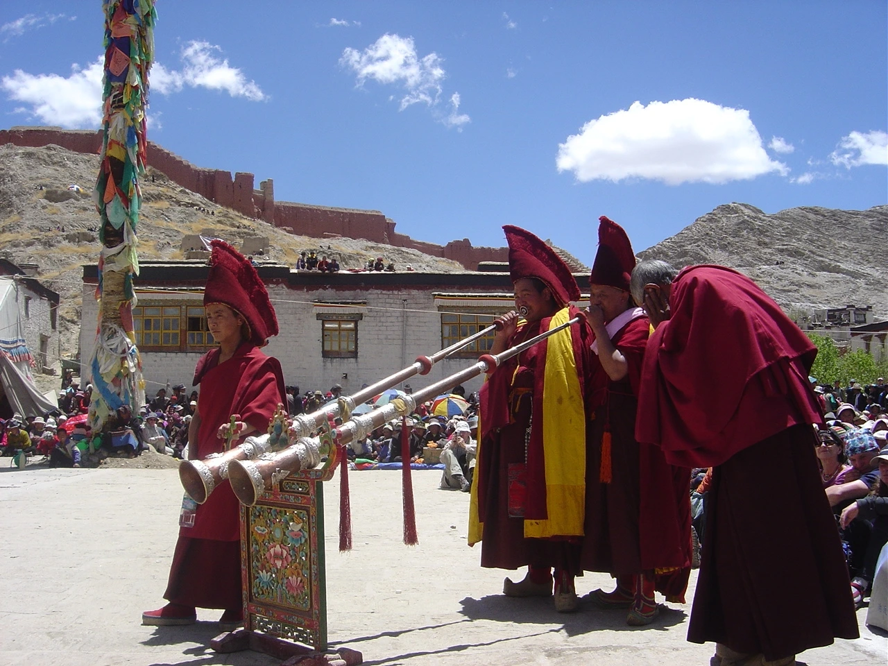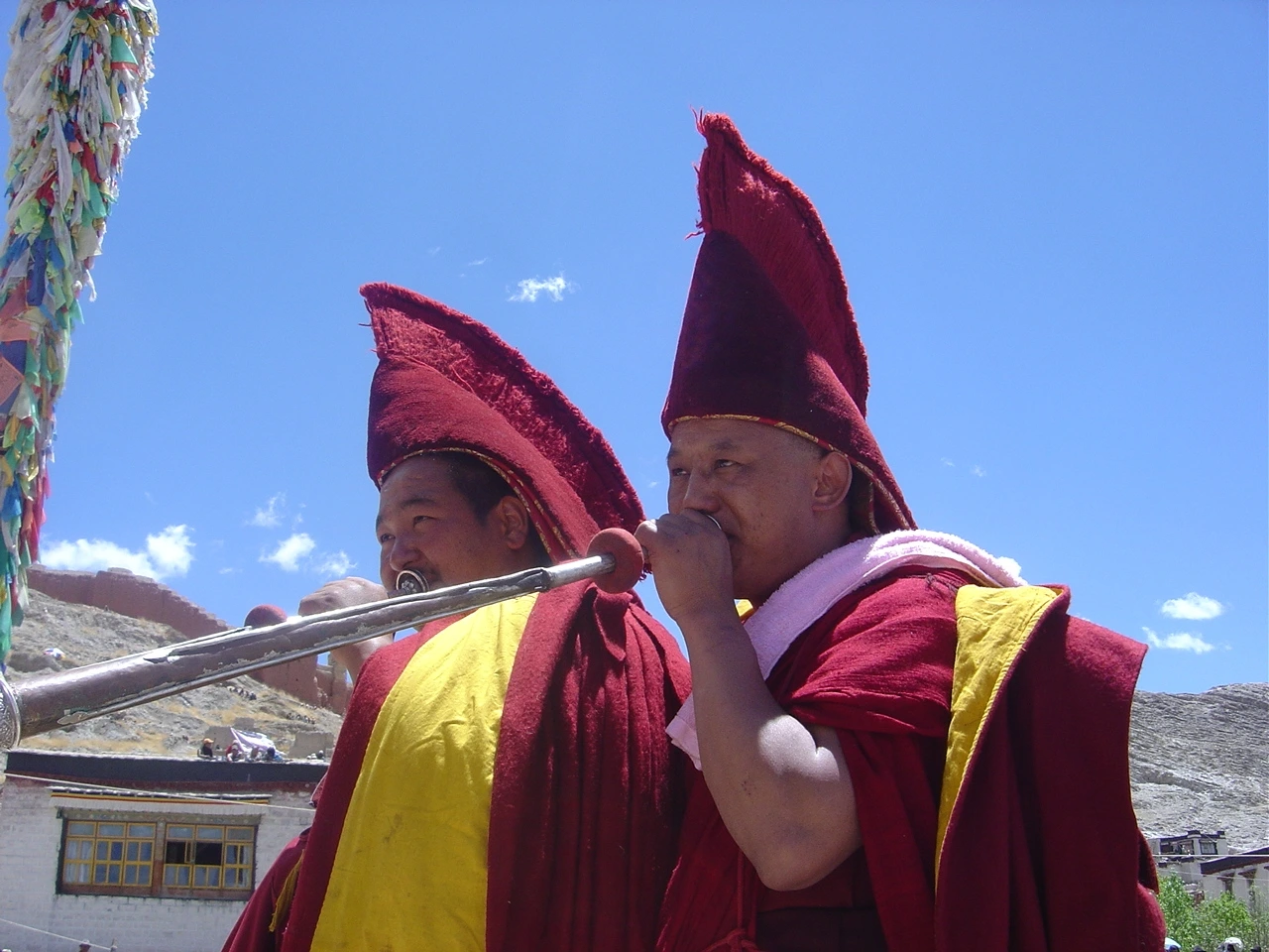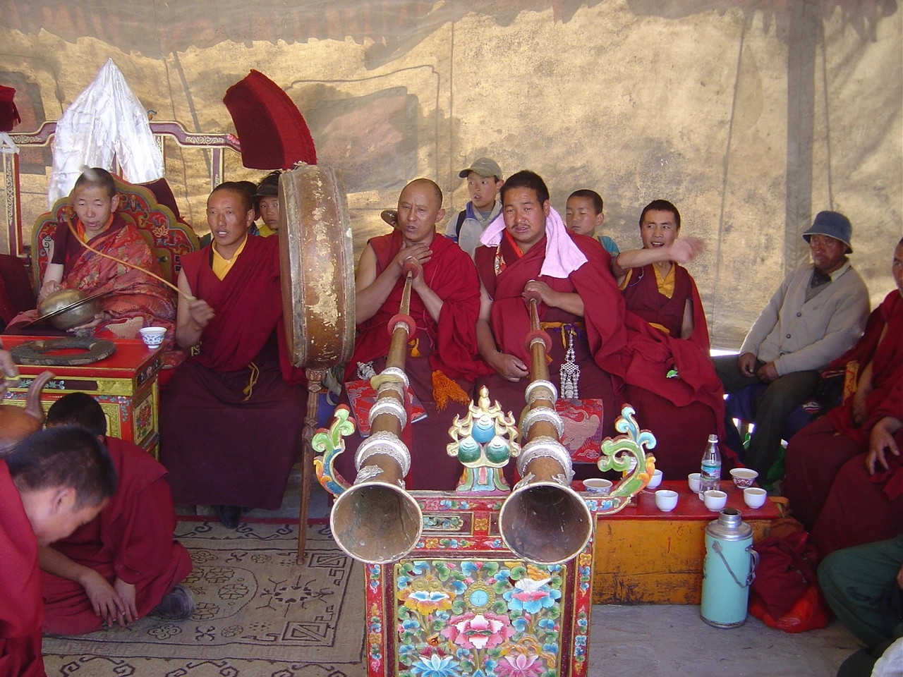 광장에 들어서니 둥첸이 "부~~~ 웅, 부~~~ 웅~~~" 하고길게 울렸다. 독수리 부리 같은 모자를 쓴 스님들이, 자신의 키보다 큰 관을 입에 대고 숨을 불어넣는다. 둥첸, ‘큰 관’이라는 뜻의 이 악기는 티베트를 상징하는 소리다. 주석과 놋쇠로 만든 관은 길게는 6미터가 넘는다. 소리는 낮고 깊어, 가슴이 아니라 뼈를 울린다. 곁에서 한 노스님이 귀를 막고 있는 모습이, 아이처럼 천진해 보였다.