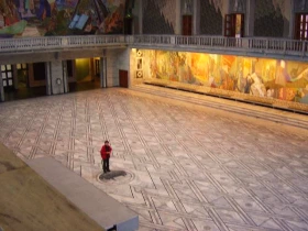 2층 남쪽 벽에는 헨릭 쇠렌센(Herik Sorensen:1882~1962)이 그린 '노동, 행정, 축제(Arbeid, administrasjon, fest)'라는 제목이 붙은 대형 벽화가 그려져 있었다. 안내원은 이 벽화에 대해서도 자세히 설명을 해주었다. 가로 42m, 세로 13m의 나무판에 그린 유화는 여러 계층의 인간들이 살면서 겪게 되는 다양한 활동을 묘사하고 있다. 가장 아래층은 불타는 주택들이 그려져 있고, 사람들은 계단을 통해 2층으로 올라간다. 2층에는 외출복을 입은 남녀들이 어울리고 있다. 3층과 4층에는 황금빛 공간에는 아마 신의 영역을 그린 것 같다. 그렇다면 우린 지금 어느 영역에 있을까?
