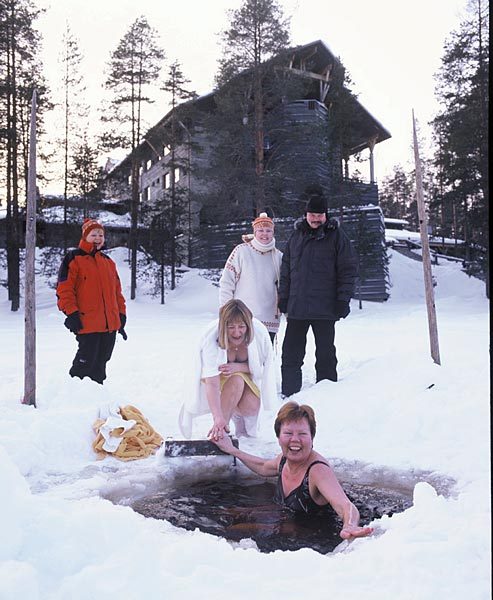 핀란드 사우나는 2000년 전부터 개발된 핀란드의 독특한 목욕법이다. ‘sauna’란 단어는 ‘땀을 빼는 일’이란 뜻이란다. 핀란드 원어가 유일하게 영어사전에 그대로 올라가 있는 단어다. 핀란드 사우나는 전기로 달구어진 돌 난로에 물을 뿌려 더운 증기를 발산하여 몸의 땀을 흠뻑 뺀 다음 얼음을 깨고 호수로 들어가 더움 몸을 식히는 방법이다. 말하자면 이냉치냉(以冷治冷) 건강법이다.