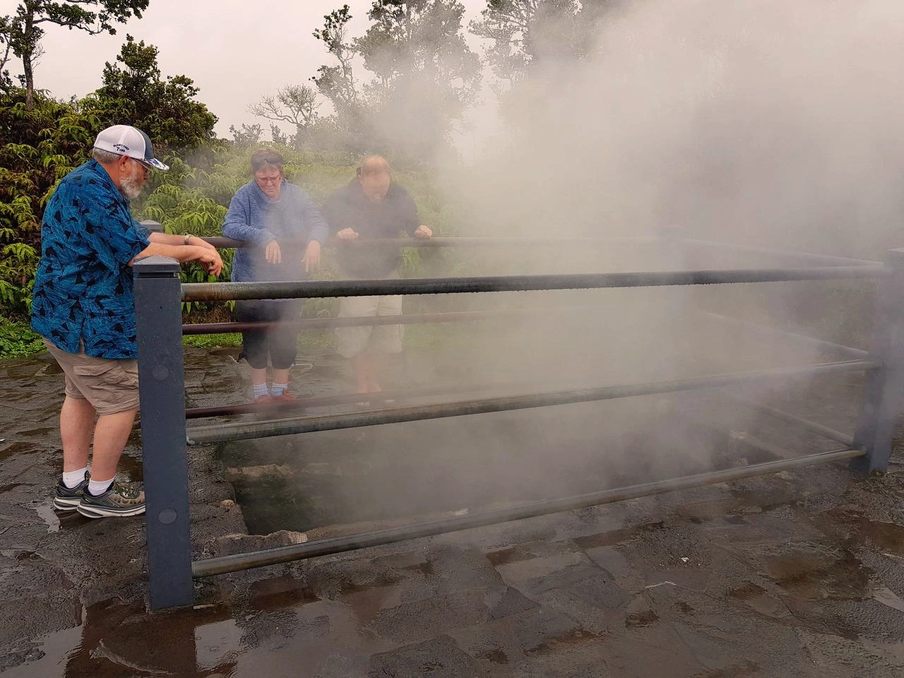 조심스럽게 스팀 벤츠 트레일을 걸으며 킬라우에아 칼데라(Kilauea Caldera)에 도착했다. 다시 비가 억수로 쏟아져 내리기 시작했다. 허지만 김이 모락모락 나는 빗속을 휘적휘적 걷는 기분은 의외로 환상적이다. 빗줄기와 수증기가 어울려 지구 어디에서도 볼 수 없는 몽환적인 풍경을 연출해주고 있다. 지구 상의 이런 데가 있다니 갈수록 지구는 신비하다는 생각이 든다. 온전히 살아 숨 쉬는 지구의 숨소리가 들리는 것 같다. 나는 수증기 속의 실루엣처럼 한참을 멍~ 하니 서 있었다. 그러다가 영이의 재촉에 퍼뜩 정신이 들었다. 우리는 다시 작은 우주선을 타고 할레마우마우로 출발했다.