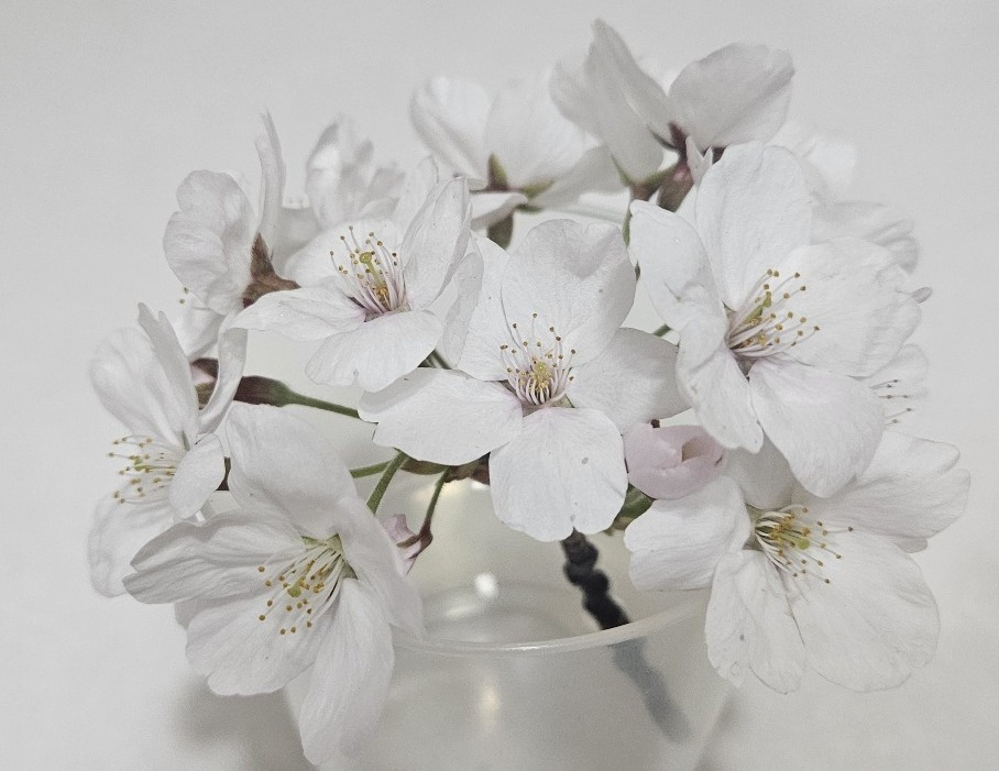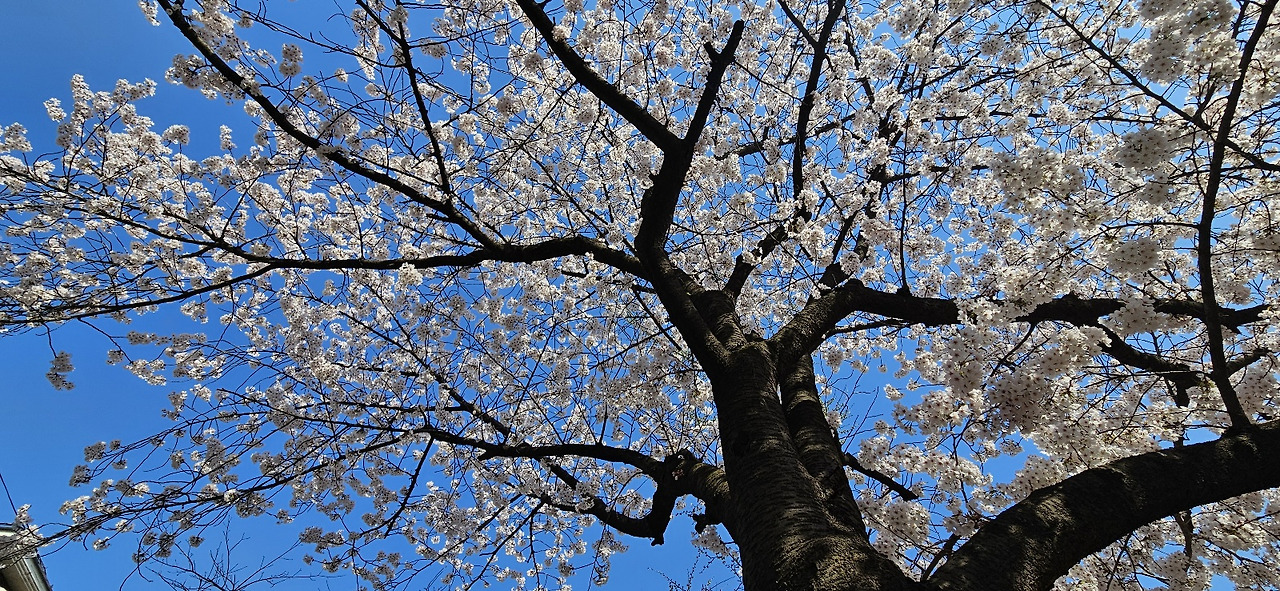 그 누가 가을이 천고마비의 계절이라고 했는가? 벚꽃으로 푸른 하늘을 수 놓은 이 장면은 그 어느 가을하늘보다도 더 푸르고 더 높지 않을까? 오늘은 봄이 천고마비의 계절이라고 해 두자. 장엄한 굵은 나무밑동에서 구불구불한 튼튼한 가지가 하늘 높이 뻗어 올라 그 위에 잔가지들이 숨쉬어 살아나고 연분홍 벚꽃들이 차곡차곡 내려앉았다. 꼭 다섯송이의 꽃집과 다섯송이의 꽃잎이 자리한다.