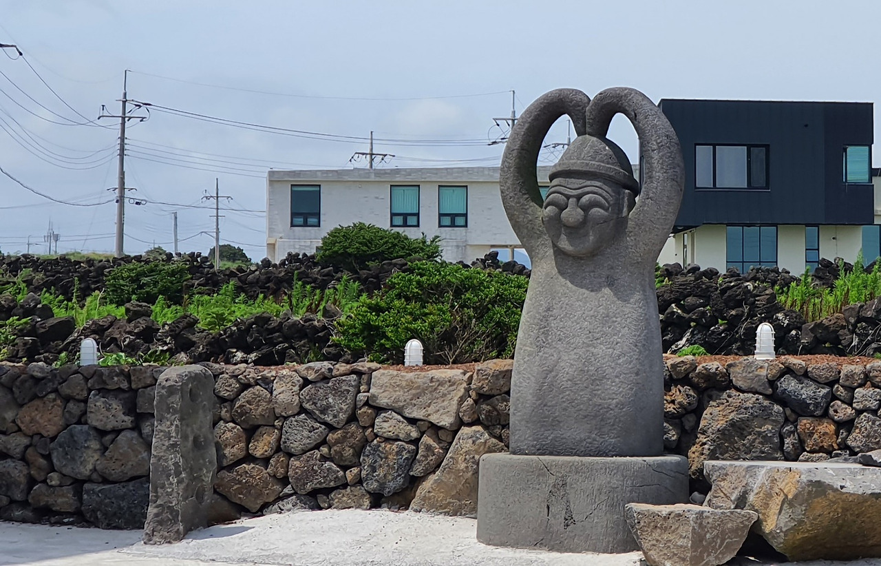 다시 접어든 바닷길에서 처음 본 돌하르방이 커다란 하트를 날리며 히죽이 웃는다. 사랑해요. 힘내요,라고 말하는 것 같아 미소를 짓는다. 흠, 제주의 센스라니! 나도 손 하트를 쏴주고. 그나마 오늘은 바람과 합이 잘 맞는 날이다. 한 방향이다. 차로 이 길을 지날 때 걷는 사람들을 보면서 언젠가 나도 꼭 걸어야지 했었는데 그 ‘언젠가’가 바로 지금이다. 차로 오가는 사람들은 무더위 속 나를 보며 무슨 생각을 할까. 어제 그 빗속을 걷던 나를 보면서는 무슨 생각을 했을까.