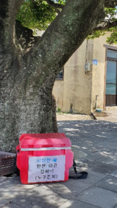 한동리에 들어선다. 느티나무를 에둘러 만들어 놓은 쉼터에서 더위를 식힌다. 거기 ‘시원한 물 한 잔 하고 갑써~!' 라고 쓰인 아이스박스가 놓여있고. 살짝 열어보니 시원한 요구르트, 얼음물이 가득 들어 있다. 요구르트 2개를 꺼내 드는데 뉴스로 접한 사건, 사고들 문득 스친다. 이런 몹쓸... 요구르트 두 개를 단숨에 털어 넣는다. 어머니의 장보따리만큼 달콤하다.