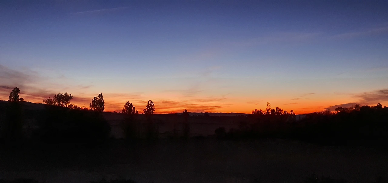 대부분 아직 일어나기 전 6시 20분에 숙소를 나섰다. 스페인의 가을 아침은 더디 온다더니 새벽녘처럼 어두워 휴대폰 전등으로 길을 밝혔다. 저 앞에서, 저 뒤에서 한 두 사람이 전등으로 길을 나섰다는 것을 알려준다. 주변은 아무것도 보이지 않고 단지 들판이구나 상상한다. 푸르스름한 하늘은 수많은 별들로 인해 더 맑다. 일찍 거동한 사람들만 볼 수 있는 특권이다. 7시경 동쪽 산등성이가 서서히 물들기 시작한다. 시간의 흐름과 걸음의 속도에 비례하여 해가 솟아오르고 있었다. 어둠에서 주황과 주홍을 거치고 화려한 색을 모두 벗은 채 모습을 보이는 태양. 드디어 모든 어둠이 연기처럼 사라지고 햇살이 내리기 시작한다. 한 치 앞을 가늠할 수 없는 어둠을 견디는 것은 이 순간을 위한 것인지도 모르겠다.