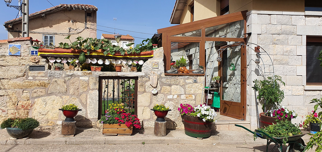 드디어 오까산을 내려오니 산 후안 오르테가다. 대부분의 순례자들은 이곳에서 묵는다. 우리는 전날 더 걸어놓았으므로 5킬로미터를 더 가기로 했다. 그래도 20킬로미터 이내다. 아헤스를 지나서!아헤스는 작은 동네이지만 집 창틀과 거리를 장식하고 있는 국화나 제라늄 등 가을꽃들이 유난히 아름다웠다. 잠시 걸음을 멈추고 사진도 찍고 마을을 둘러보았는데마을 사람들의 정성과 꼼꼼하고 밝은 성정들이 보이는 듯했다. 순례자들을 위한 배려로 와 닿아서 걸음이 따듯해졌다. 어디 그뿐인가. 비포장도로를 지나는 차들은 걷는 사람을 만날 때마다 속도를 최대한 낮춘다. 흙먼지가 날리지 않도록. 무거운 걸음에도 마음이 가벼워지고 나도 모르게 미소가 지어진다.