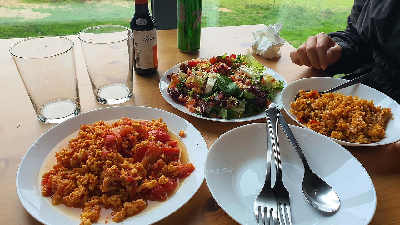 다 젖은 옷가지를 세탁기에 돌리고 숙소 앞 구멍가게에서 간단한 저녁거리를 사다 일찌감치 저녁도 먹어 치웠다. 토마토 볶음, 샐러드, 빠에야에 오늘은 더 고생했으니 와인도 한잔. 1500미터 고지대 알베르게 주방 식탁에 앉아 바라보는 바깥 풍경은 변화무쌍하다. 산과 능선들이 자욱한 안개에 사라졌다 나타나고 마당 빨랫줄과 빨래집게들이 할 일을 잃은 채 하염없이 비에 젖고 있다.