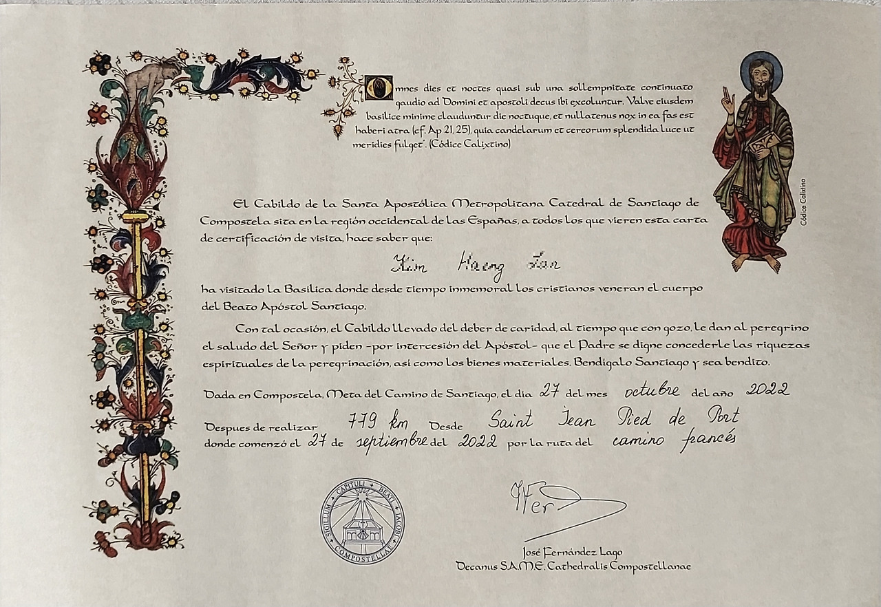 마침내 대성당 근처에 있는 순례자 사무실에 도착했다. 생각보다 담담했다. 늦은 시간이어서인지 기다리지 않고 바로 등록 후 779킬로미터 완주증을 받았다. 마치 긴 주경야독의 졸업장을 받은 듯 뿌듯했다. 다시 오지 않을 지난날들과 함께 보관통에 고이 간직했다.