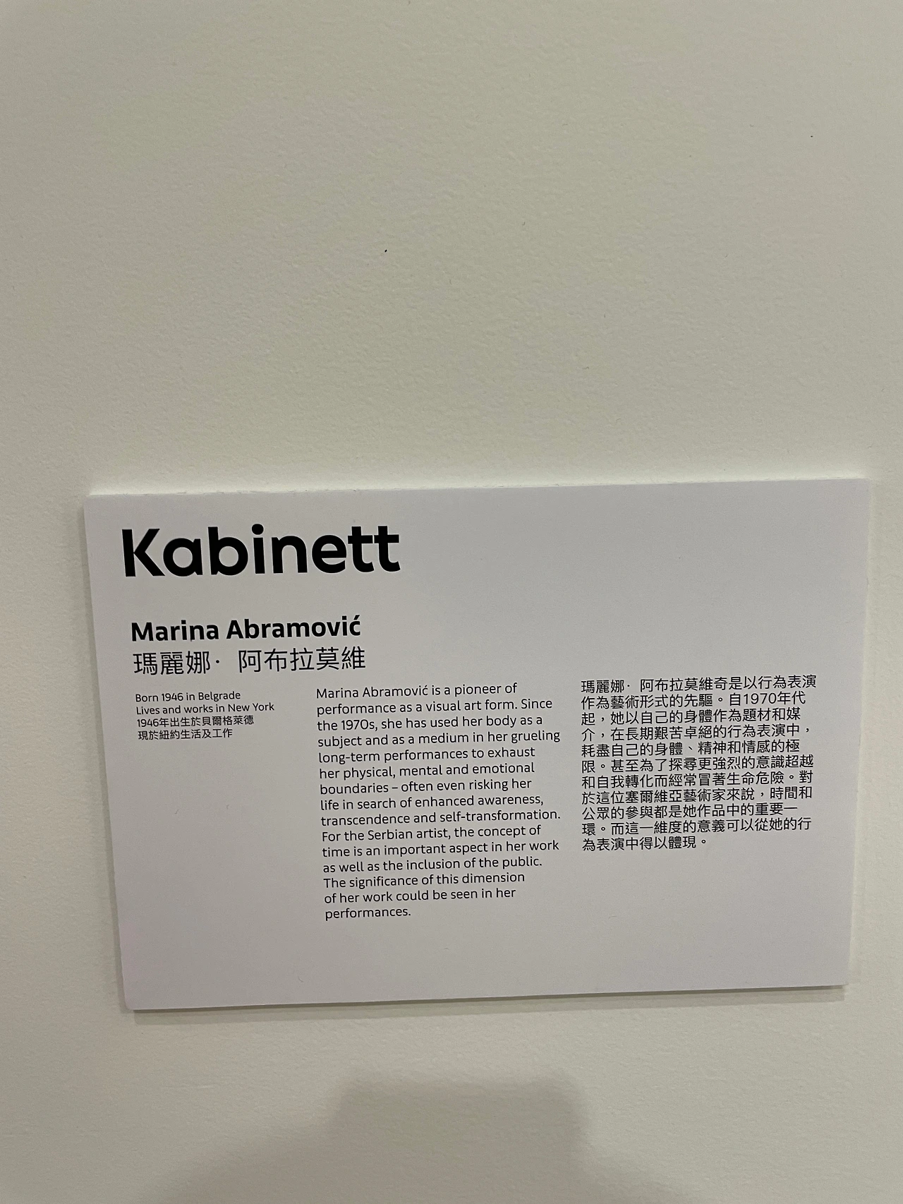 그중에서 인상 깊었던 아티스트를 몇 적어보자면 대만 아티스트 '시진화'와 세르비아 아티스트 '마리아나 아브라모비치'였다. 시진화의 작품은 흰색 도화지에 연필 선이 죽죽 그어져 있어 언뜻 보면 누군가 수업 시간에 몰래 낙서를 한듯한 인상을 주었다. 하지만 그의 작품에는 명암이 확실하게 표현되어 있었다. 중앙으로 갈수록 명도가 짙어져 심지가 또렷하게 박혀있는 나무 기둥이 뉘어져 있는 것처럼 보였다. 작품 옆에는 그가 직접 불경을 외면서 10m가 되는 흰 벽에 선을 긋는 '펜 워킹' 퍼포먼스를 하는 모습이 영상으로 상영되고 있었다. 독특하고 신비한 작품 세계에 놀라 그의 이력을 다시 살펴보는데 안타깝게도 2024년에 교통사고로 목숨을 잃었다고 적혀있었다.