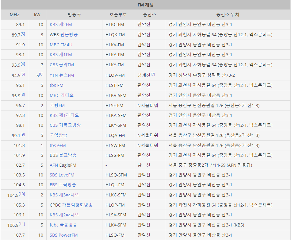한 번은 이런 일이 있었어요. 좋은 중고 튜너가 나와서 구입하러 갔는데 불행하게도 그곳은 관악산 근처였습니다. 사실 어느 튜너라도 관악산 근처에서는 FM 신호가 기가 막히게 잡히는데 그 이유는 바로 아래 보시는 바와 같이 FM 송신소 위치가 관악산이기 때문입니다. 그런 줄도 모르고 그것을 집에 들고 와서 별짓을 해보아도 맑은 소리가 나오지 않았던 적이 있었습니다. 결국 오버홀 비용이 15만 원이나 들었었습니다.
