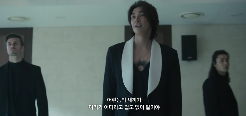 후반부 문백은 완전한 화이트 슈트 차림. 목에는 십자가까지 걸고 있죠.