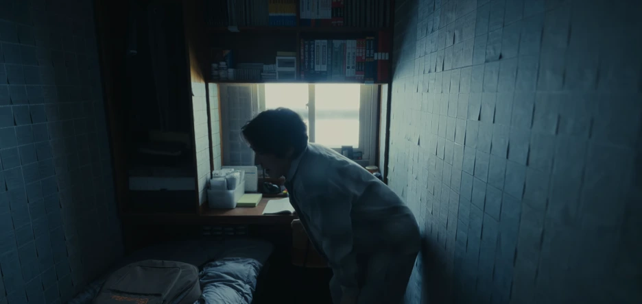 공시생의 고시원 방은 성인 한 사람이 양팔을 겨우 뻗을 수 있는 폭. 고시원의 벽은 콘크리트가 아니라 두드리면 울림이 돌아오는 석고보드를 겹쳐놓았지요. 벽은 경계가 아니라 위태로움 그 자체입니다. 게다가 벽을 가득 덮은 종이 포스트잇은 인물의 불안한 심리와 얇은 벽의 위태로움을 더 배가시킵니다. 이 좁고 위태로운 공간이 결국 내면의 분노를 터뜨리는 무대가 됩니다.