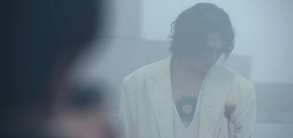 전통적으로 흰색은 순수·희생을 상징하지만, 그의 손에 들린 총이 그 상징을 전부 비틀어버립니다.