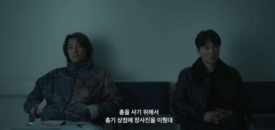 간호사가 총을 마주한 곳은 작은 사물함 앞. 카메라는 택배 상자 속 총과 간호사의 얼굴을 하나의 앵글에 담습니다. 분노의 레이어가 밀도 높게 쌓여가는 순간이죠. ‘쏠까 말까’라는 찰나의 고민이 시각적으로 고여버립니다. 정적인 장면인데도 긴장감은 최고조입니다.