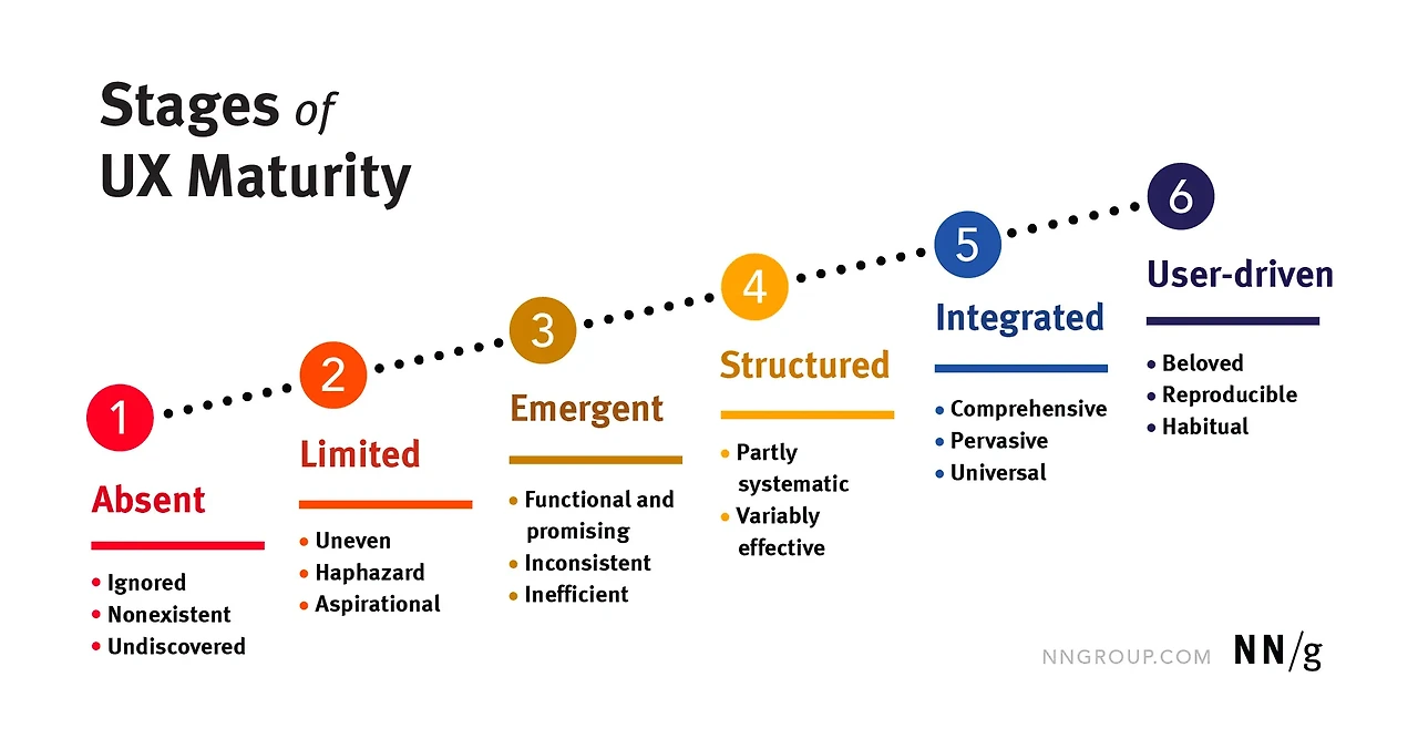 마침 고민중인 것과 눈에 띈 아티클이 딱 관통하는 주제여서 함께 공유하려 한다. 바로 '디자이너가 최근 직장을 그만두는 이유'(eopla.net/magazines/9744)의 '소규모팀, 그리고 디자인이 미숙한 회사를 떠나는 디자이너'에 대한 부분인데 여기서도 닐슨 노먼 그룹의 'UX 성숙도의 6가지 레벨' (https://www.nngroup.com/articles/ux-maturity-model/)이라는 글을 인용했다.