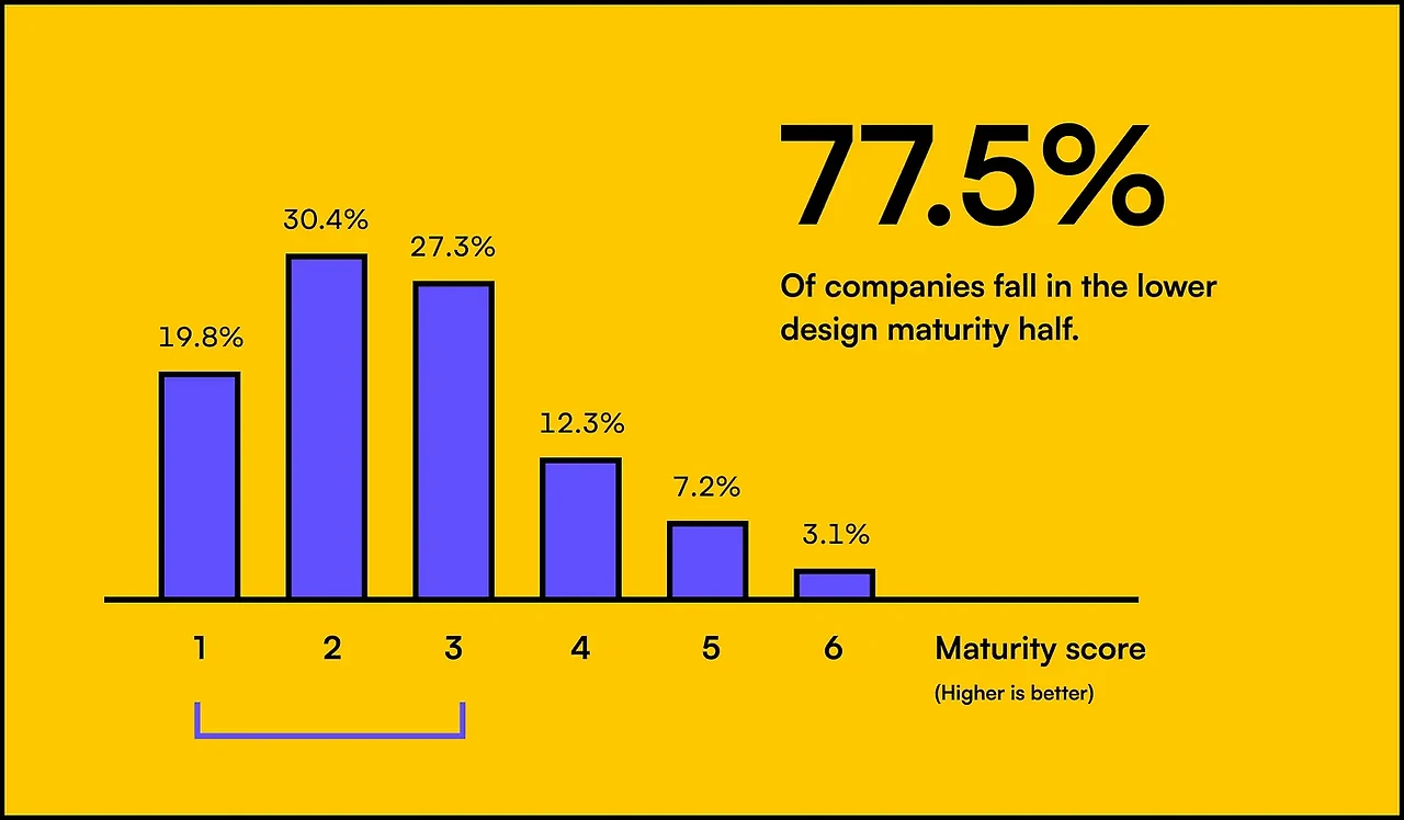 통계에서는 조직에서 77.5%가 1~3정도의 성숙도를 보여주고 있을 정도로 매우 낮다. 그동안 경험한 모든 조직에서 1정도의 성숙도를 보여왔는데 대부분의 리더 및 오너의 생각이 결과에 중심이 되어 있기 때문이라고 생각든다. 제품을 빠르게 만들어야 하며, 매출을 일으키는 것에 초점이 맞춰져 있다. 빠르게 만들다보니 사용성은 제쳐두고 기능 동작을 중심으로 만들 수 밖에 없고, 얼기설기 만든 제품에 매출을 일으켜야 하니 마케팅을 태운다. 돈을 부어 일으킨 매출에 일희일비하며 부가기능을 만든다. 또한 사용자에 맞춰져야 할 제품 경험이 대표, 리더 혹은 내부 직원에게 맞춰져 있기 때문이라고 생각한다. 대표나 우리는 만드는 사람이지 사용자가 아니다.