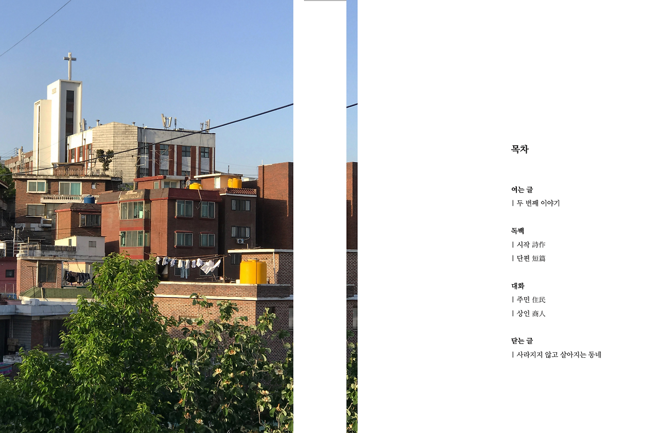 이 동네를 배경삼아 살고 있는 사람들, 이 동네가 배경이 되어 일하는 사람들을 만났다. 그리고 그들에게 질문하고, 때때론 답을 하기도 했다. 내가 바라보는 동네와 그들이 바라보는 동네가 무엇이 비슷하고, 무엇이 다른지에 대해 나눴다. ‘재개발’, 사라질 동네라는 수식어와 더불어 떠나야만 하는 운명 앞에 놓여진 터전에 산다는 것에 대한 소회도 함께.