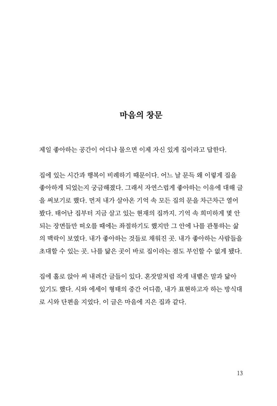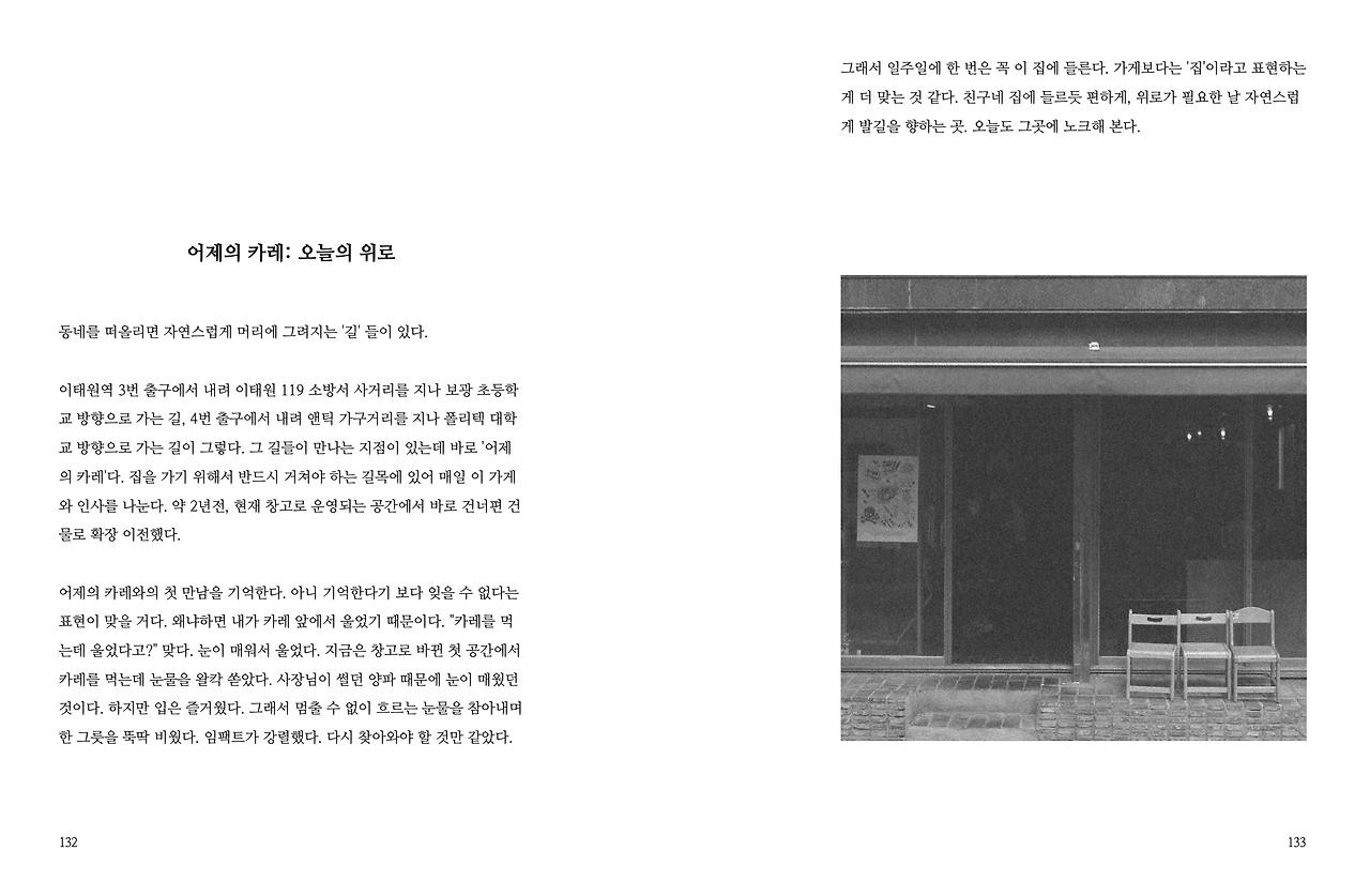 '집'이 '나'에게 소속감을, '동네'가 '나의 집'에 소속감을 주는 것이 아닐까 하는 질문도 던져보게 됐다. 본질적으로 집을 애정하게 된 이유에 대해 답을 할 때 결코 빼놓을 수 없는 단어가 바로 동네이기도 했다. 매력적인 동네의 요소가 여러 가지 있겠지만 개인적으로 이 책을 쓰며 ‘사람’, ‘풍경’ 그리고 ‘나와의 어울림’ 이 3가지로 정리할 수 있었다.