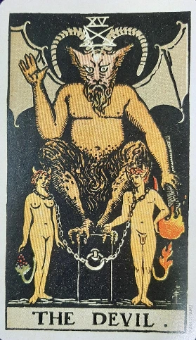 이 카드가 상징하는 바는 우리가 가진 내부의 약점과 어둠이다. 우리가 가진 약점은 많겠지만 특히나 이 카드는 문란한 성적인 에너지, 나쁜 관계, 집착 등을 상징한다. 그런데도 악마카드는 사람을 잡아끄는 힘이 있다. 우리가 범죄영화나 사이코패스 영화를 궁금해하는 것처럼 평범한 것에서 맛볼 수 없는 특별한 쾌락을 맛보게 해주는 듯하다.