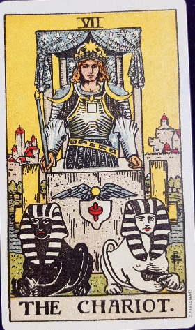 전차카드는 무엇보다 승리를 의미한다. 여기서 승리란 외부에서 오는 도전을 극복하고 성공하는 것이다. 카드 속 젊은이는 자신만만한 표정으로 두 마리의 스핑크스가 끄는 전차를 타고 있다. 별이 달린 왕관을 쓰고 어깨에는 초승달이 걸린 갑옷을 입고 있다. 전투에서 승리한 뒤 거리를 행진하는 젊은 장군이거나 왕의 자리를 물려받을 왕자로 보인다. 그러니 이 야심찬 젊은이의 귓가에는 얼마나 큰 환호성이 울리고 있을까. 떨어지는 꽃잎이 길을 뒤덮고, 팡파레가 사방으로 퍼지고, 환희에 찬 사람들이 그를 올려다보고 있을 것이다. 그럼에도 젊은이는 침착함을 잃지 않는다. 자신이 이룰 성공은 끝난 것이 아니라는 듯 입술을 꼭 다물고 있다.