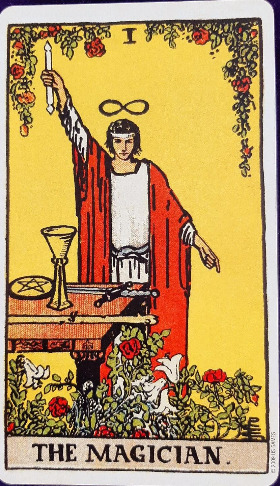 점술가를 나타내기에 적당한 타로카드는 메이저 1번 마법사이다. 마법사는 열정을 나타내는 빨간 장미와 순수를 나타내는 흰 백합에 둘러싸인, 생명의 나무 그늘에 서 있다. 수정막대를 쥔 손은 하늘을 가리키고, 둘째 손가락을 펼친 다른 손은 땅을 가리킨다. 마치 하늘의 뜻이 땅에서 이루어지리라고 말하는 듯하다. 그리고 그의 머리 위에는 영원성을 상징하는 무한대표시가 그려져 있다. 그의 정신은 영원성을 향해있고, 그것으로부터 영감을 받는다. 마법사 앞에는 지,수,화,풍을 상징하는 막대, 컵, 팬타클, 검이 탁자 위에 놓여있다. 마법사는 물질세계의 4원소를 자유자재로 다룰 수 있다는 뜻이다.