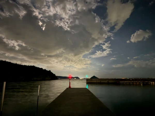 여독을 풀었다는게 이런 느낌일까. 몸은 나른한데 마음은 가볍다. 숙소로 들어가지 않고 기와장이 덮혀있는 가구들 사이로 어둑어둑한 길을 걸어 나오니 바로 밤바다가 보인다. 마을 어귀에 있는 작은 신사엔 작은 가족들 단위로 모여 북을 치고 있는데, 낮고 둔탁한 소리가 섬마을을 울릴 정도다. 부둣가엔 사람이 거의 없고 깜깜했다. 벌레도 없고 춥지도 덥지도 않은 바람의 체온. 파도도 없이 잔잔한 바다. 아무생각없이 저기 앞에 유독 환한 빛을 내고 있는 조형물로 향했다. 가까이 다가가자 커다란 조명 뒤 숨어있던 작은 방파제 길이 보였다. 어둠에 발을 내딛고 들어서자 거기선 파도가 제법 철썩거린다. 간간히 지나가는 차의 헤드라잇 불빛 외엔 전혀 빛이 없는데다 둑의 폭이 좁아, 자칫 발을 헛딛어 바다로 빠질까봐 겁이 난다. 물결의 흔들림과 방파제에 와서 부딪히는 소리로 경계를 구분하며, 조금씩 걸어가 방파제 끝 불빛 기둥 앞에 가방을 내리고 주저앉았다.