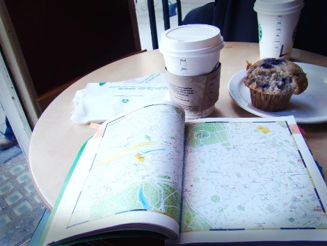 카페에 들어가 커피 한잔과 아침식사 대용으로 먹을 머핀을 시키고 자리를 잡고 앉았다. 여행 계획을 세워 보려고 책을 펼쳤는데 나도 모르게 피식피식 헛웃음이 세어 나왔다.