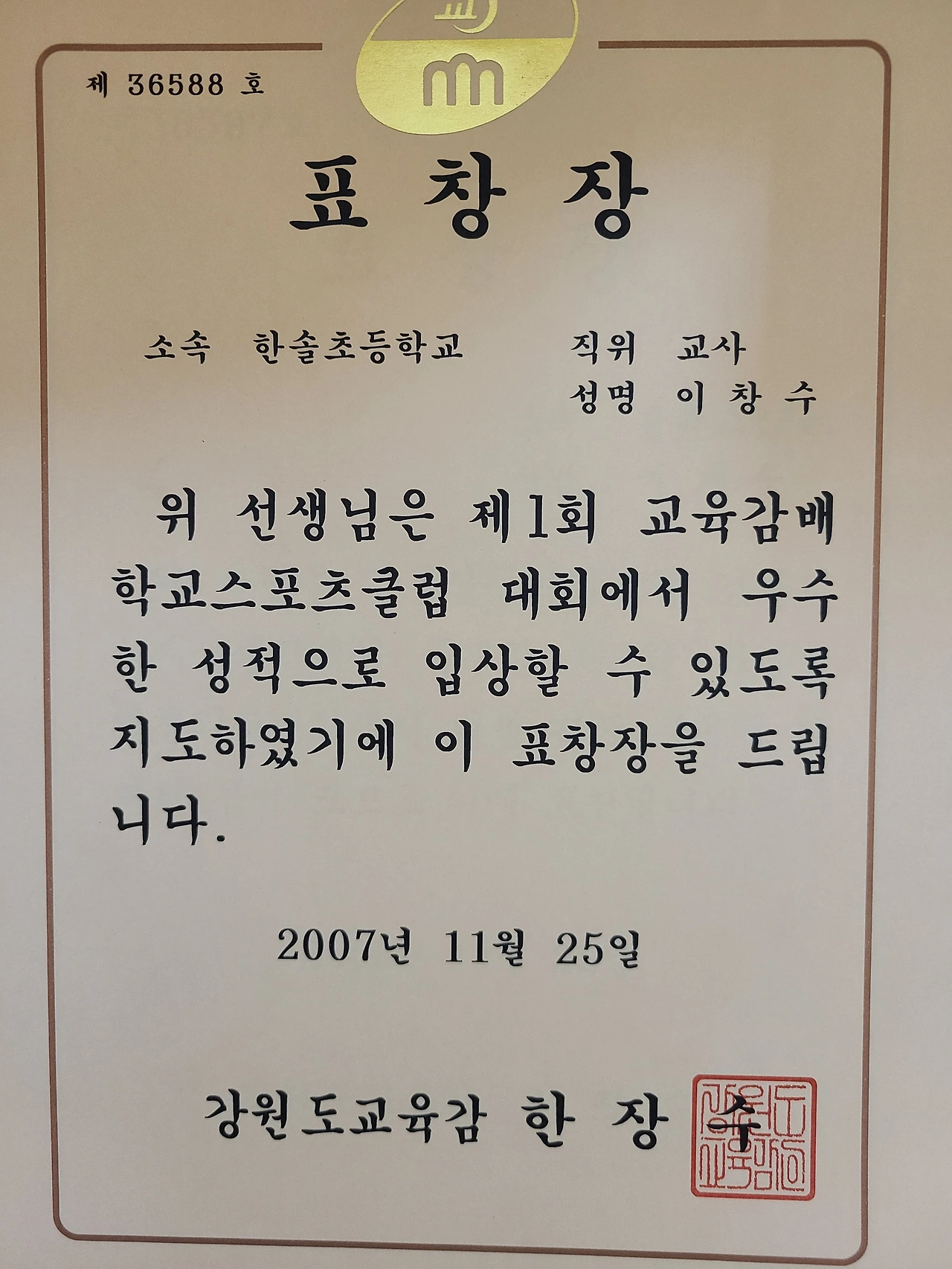 참고로, 놀라운 사실은 나는 강원도에서 개최한 제1회 학교스포츠클럽 단체줄넘기 대회 초대 우승 감독이다. 그때 학교 학생들을 지도하여 당당히 1위를 했고 그 결과로 교육감 표창을 받은 바 있다. 지금으로부터 15년 전 일이다.