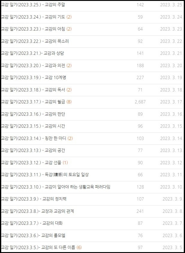 그동안 써 온 '교감 일기' 중에 3월 목록 일부분을 살펴보면 이렇다.