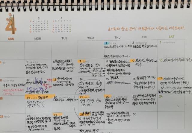 나는 철 지난 탁상 달력을 보관해 둔다. 2021년부터 교감 업무를 하면서 버리지 않고 모아 두고 있다. 업무의 연속성에서 도움을 얻을 수 있는 메모들이 있기 때문이다. 아무개 선생님이 언제 군 입대를 했는지 기억이 가물가물할 때 지난해 탁상 달력 몇 장만 들춰 보면 바로 알 수 있다. 나중에 스프링 제본으로 되어 있는 부분들을 뜯어서 한 장 한 장 모아 제본하면 하나의 역사책이 되지 않을까 싶다. 일기장은 줄글로 썼기 때문에 한눈에 살펴보기가 어렵다. 탁상 달력에 짤막하게 메모해 둔 것은 가독성이 높다. 다음 연도에 업무를 추진할 때 참고 자료가 된다.