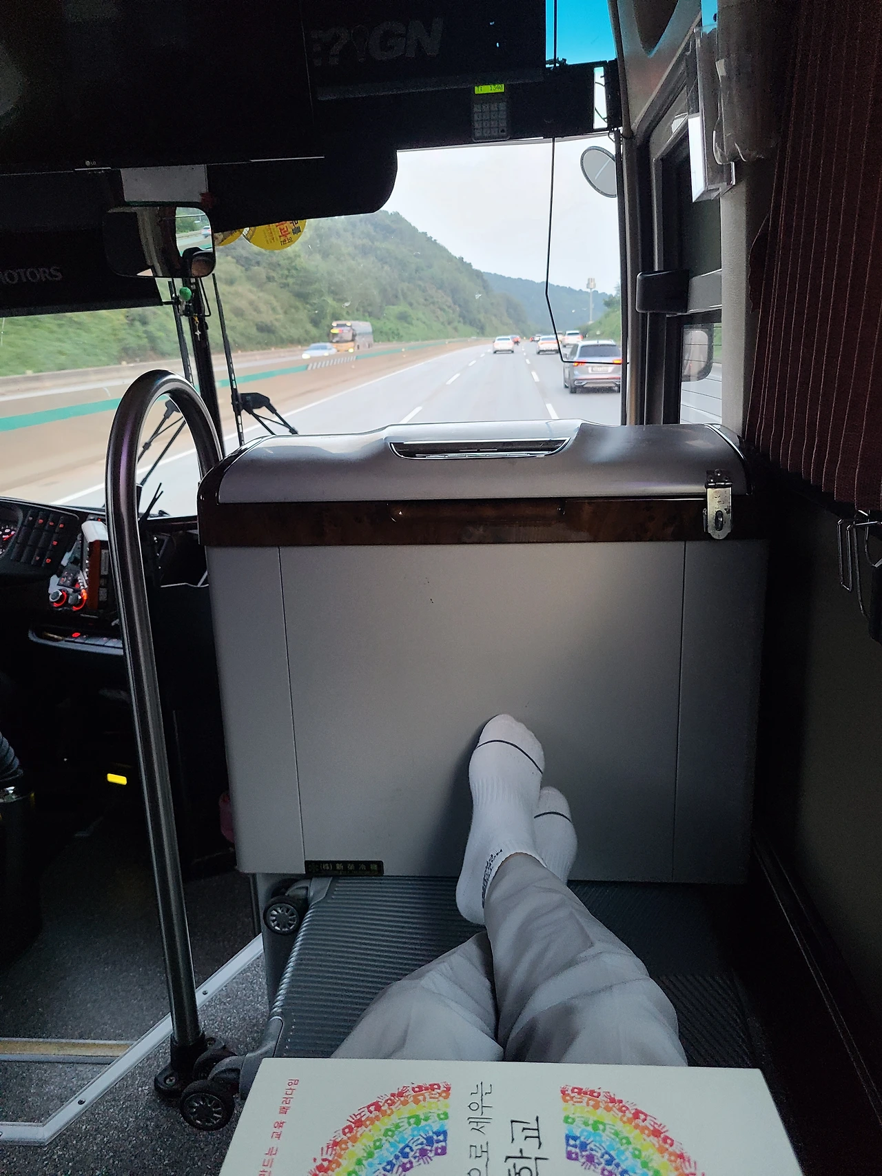버스 좌석이 맨 앞자리라 두 다리 쭉 펴고 간다. 장거리 갈 땐 운전석 반대편 맨 앞자리(3번) 강력 추천한다. 거기다가 여행 가방을 눕혀 놓고 발 올려놓고 있으면 안방에 다리 펴고 앉은 느낌. 버스 짐칸에 안 놓길 잘했다. 버스 안은 에어컨 바람에 춥다. 내일 입을 정장 외투를 꺼내 입고 있다.