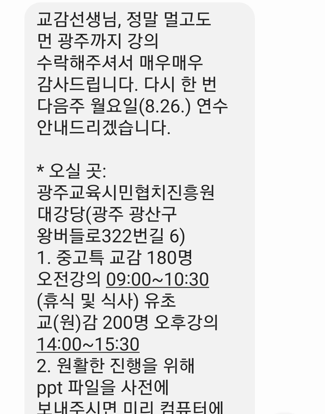 내일 광주광역시 교육청 소속 중학교, 고등학교, 특수학교, 초등학교, 유치원 교감(원감) 선생님들 380명 대상으로 강의한다. 기적이다.