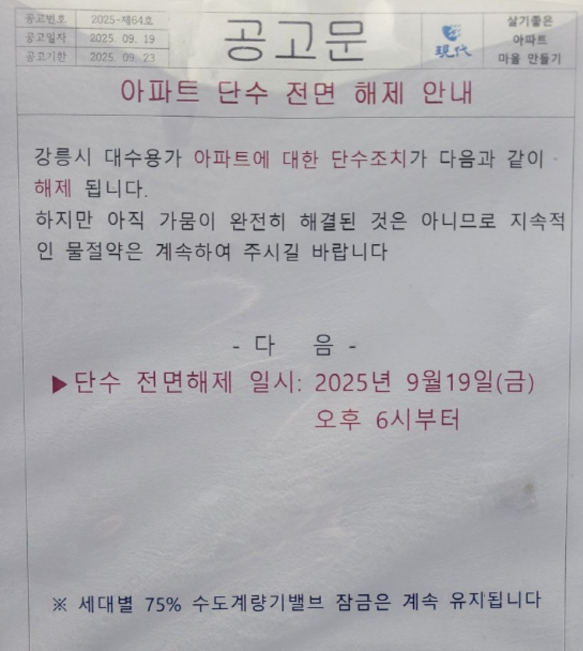 드디어 강릉에도 비가 내리기 시작했다. 2025년 9월 19일 금요일 저녁 6시부터 아파트 수돗물 단수 조치가 해제되었다.