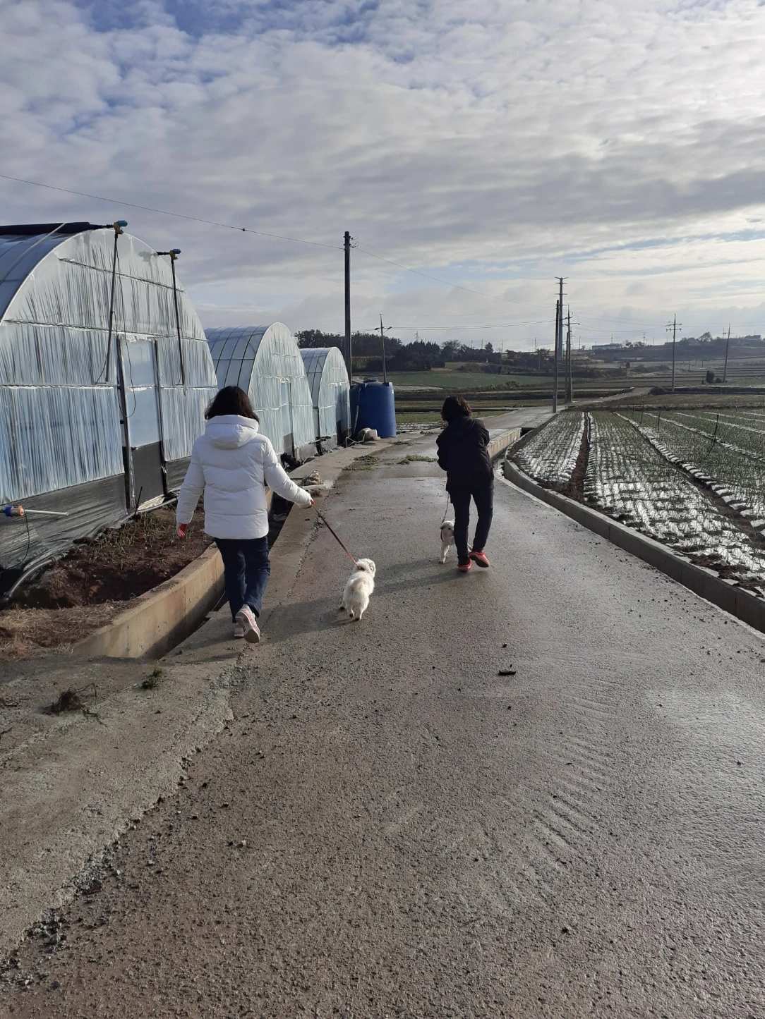 십여 년 동안 개를 키워본 수연의 가이드 덕에 두 녀석과 안전하게 산책을 다녀왔다. 친구들 가고 난 뒤 미남이를 대하는 데 도움이 많이 되었다. 개를 무서워하는 민지는 뒤에서 우리 사진을 찍으며 따라다녔다.