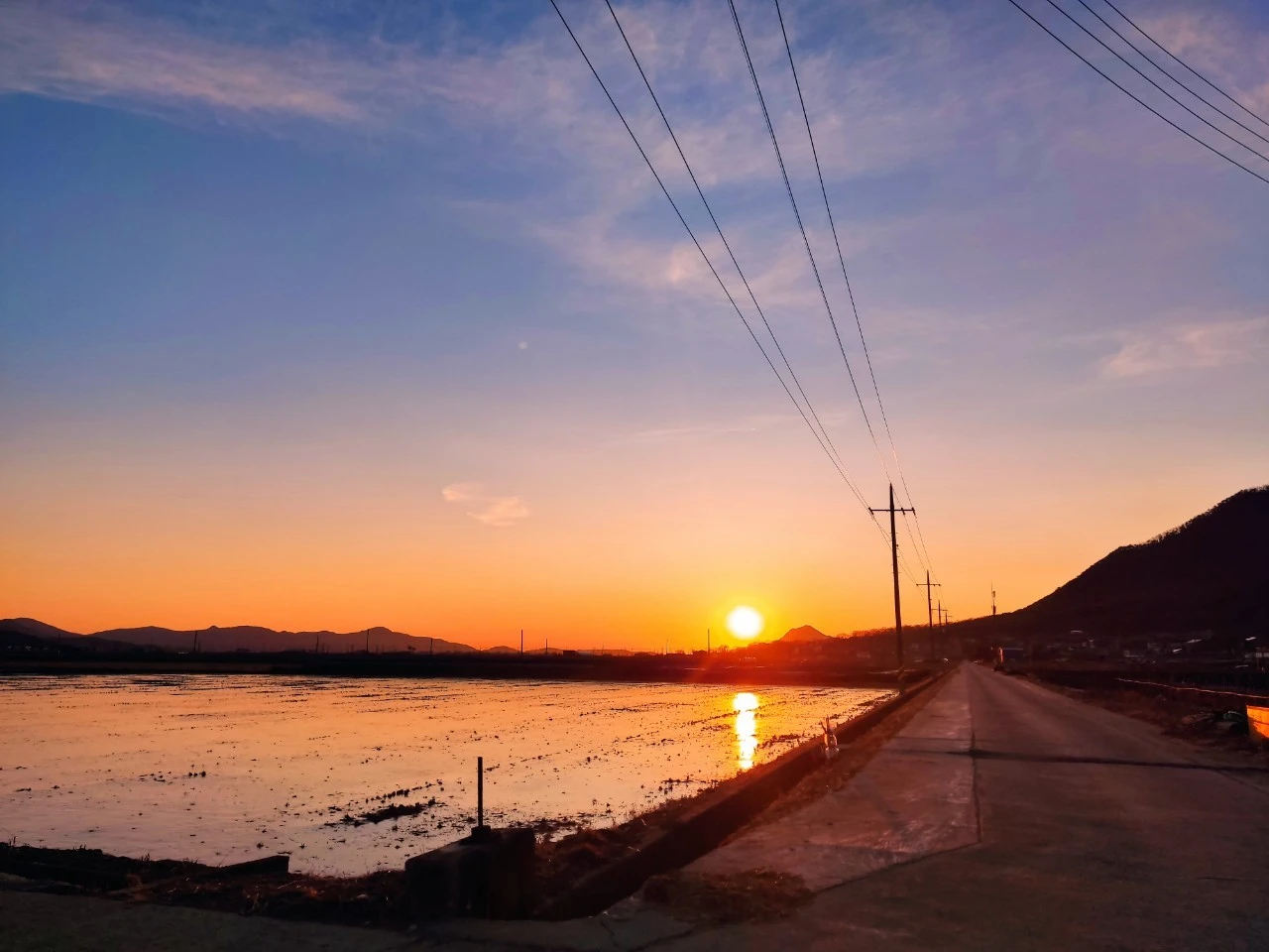 아름다운 빛깔에 취해 사진을 찍으려고 정차할 곳을 찾았지만, 산이나 건물이 장애물이 되었다. 체념할 무렵 시야에 탁 트인 벌판이 펼쳐졌다. 차에서 뛰어내린 나는 몇 컷을 사진에 담았다. 저녁놀을 좋아하는 내게 반가운 선물이었다.